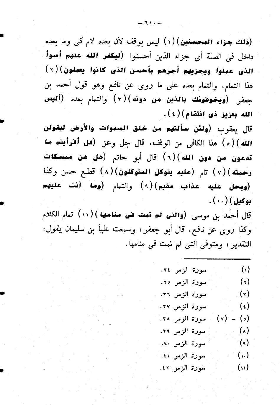قال أحمد بن موسى {والتي لم تمت في منامها} تمام الكلام وكذا روي عن نافع، قال أبو جعفر: وسمعت عليا بن سليمان يقول: التقدير: ومتوفي التي لم تمت في منامها.