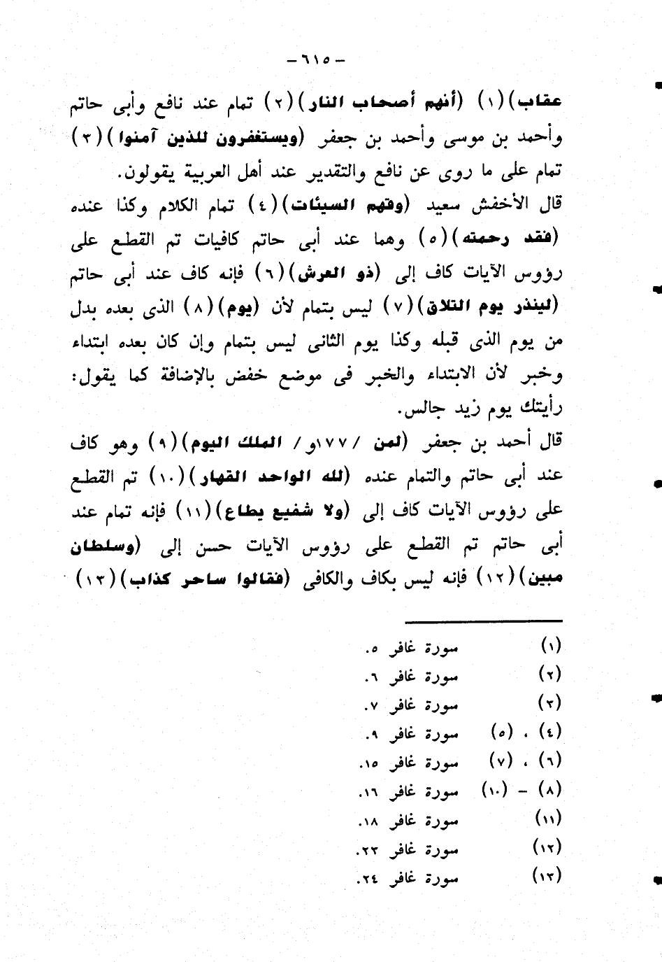 قال أحمد بن جعفر {لمن الملك اليوم} وهو كاف عند أبي حاتم والتمام عنده {لله الواحد القهار} تم القطع على ر ؤوس الآيات كاف إلى {ولا شفيع يطاع} فإنه تمام عند ابي حاتم تم القطع على رؤوس الآيات حسن إلى {وسلطان مبين} فإنه ليس بكاف والكافي {فقالوا ساحر كذاب}.