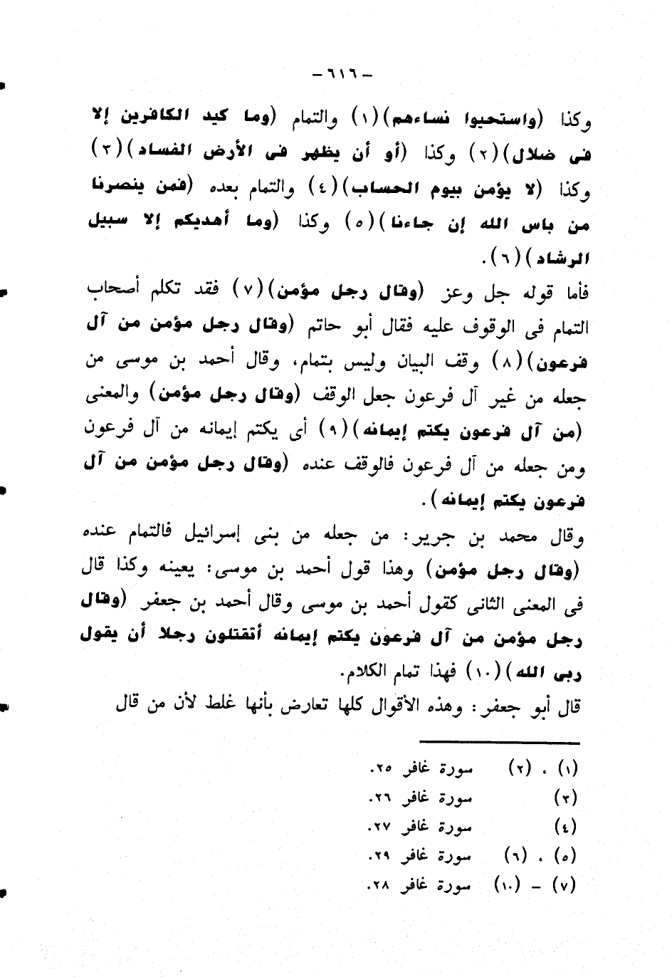 وقال محمد بن جرير: من جعله من بني إسرائيل فالتمام عنده {وقال رجل مؤمن} وهذا قول أحمد بن موسى: يعينه وكذا قال في المعنى الثاني كقول أحمد بن موسى وقال أحمد بن جعفر {وقال رجل مؤمن من آل فرعون يكتم إيمانه أتقتلون رجلا أن يقول ربي الله} فهذا تمام الكلام.