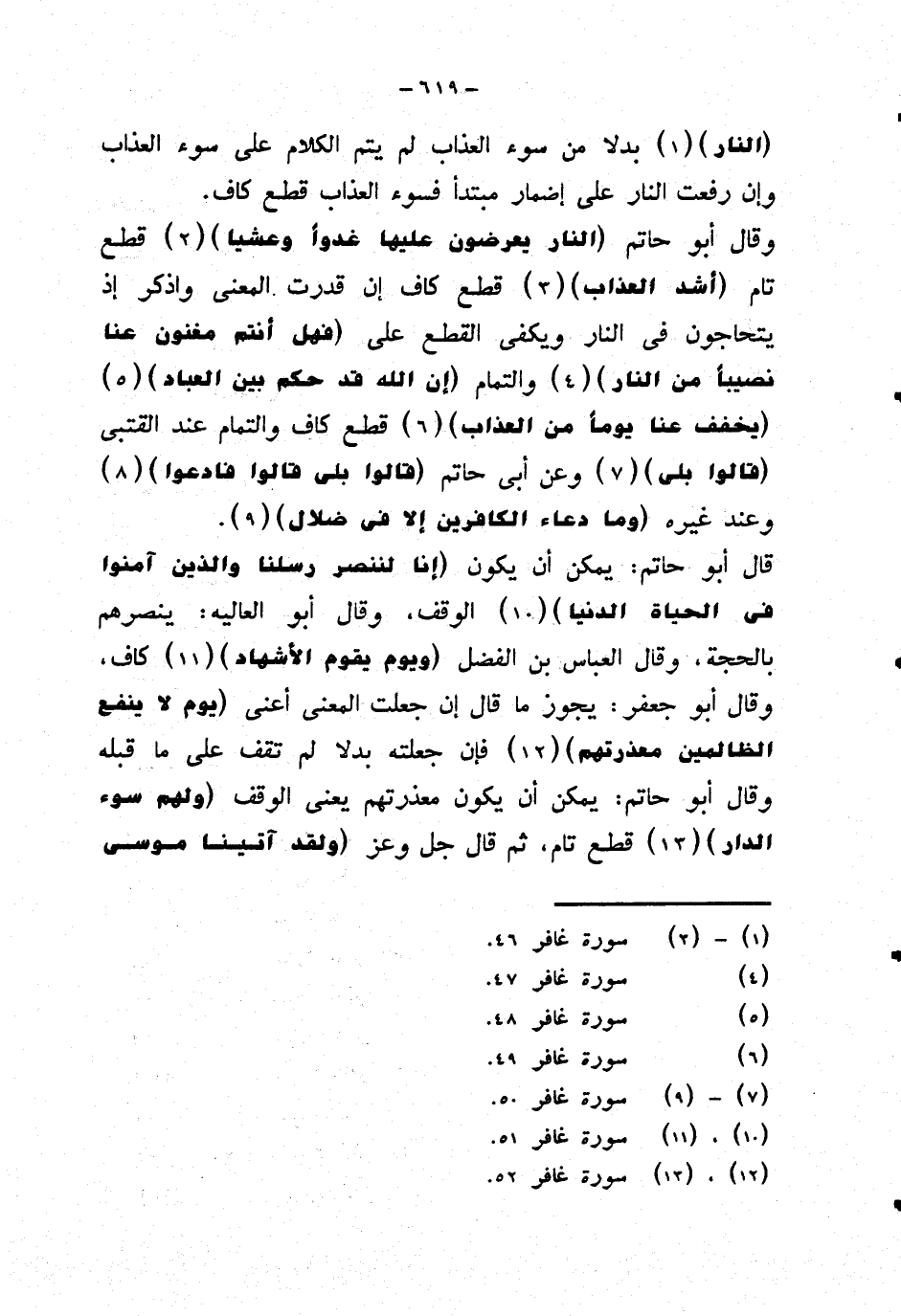 وقال أبو حاتم {النار يعرضون عليها غدوا وعشيا} قطع تام {أشد العذاب} قطع كاف إن قدرت المعنى واذكر إذ يتحاجون في النار ويكفي القطع على {فهل أنتم مغنون عنا نصيبا من النار} والتمام {إن الله قد حكم بين العباد} {يخفف عنا يوما من العذاب} قطع كاف والتمام عند القتبي {قالوا بلى} وعن أبي حاتم {قالوا بلى قالوا فادعوا} وعند غيره {وما دعاء الكافرين إلا في ضلال}.
