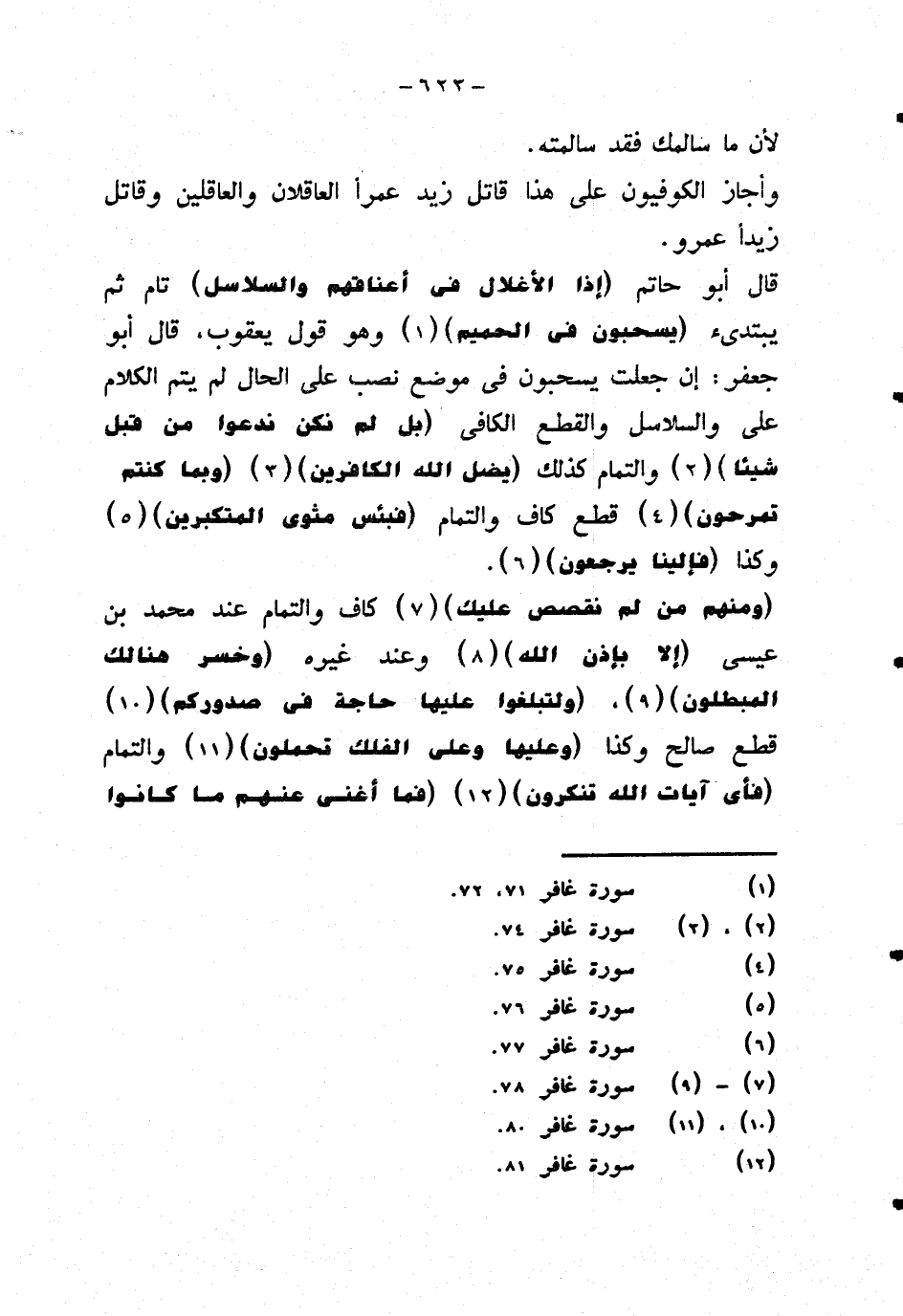 قال أبو حاتم {إذا الأغلال في أعناقهم والسلاسل} تام ثم يبتديء {يسحبون في الحميم} وهو قول يعقوب، قال أبو جعفر: إن جعلت يسحبون في موضع نصب على الحال لم يتم الكلام على والسلاسل والقطع الكافي {بل لم نكن ندعوا من قبل شيئا} والتمام كذلك {يضل الله الكافرين} {وبما كنتم تمرحون} قطع كاف والتمام {فبئس مثوى المتكبرين} وكذا {فإلينا يرجعون}.