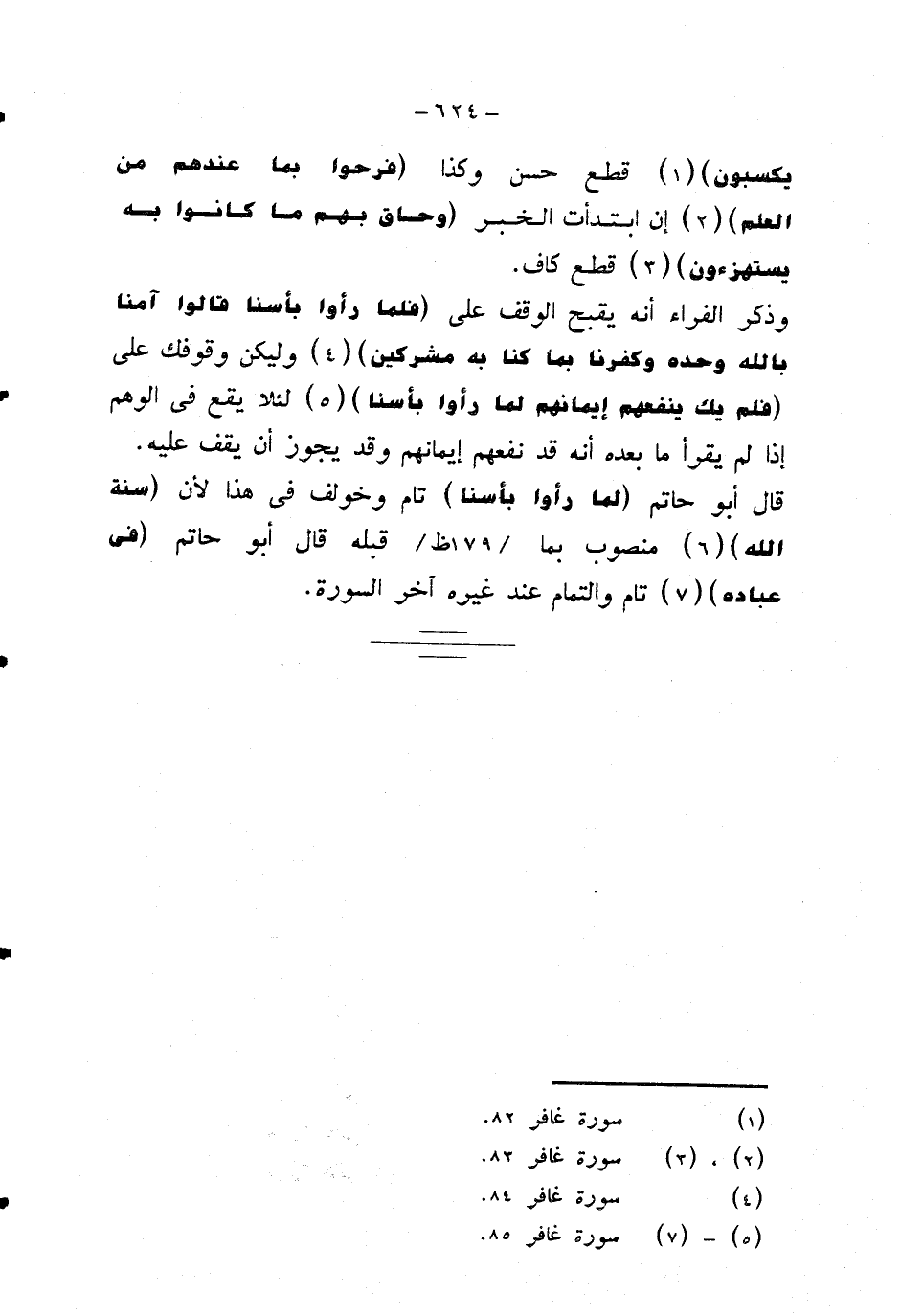 قال أبو حاتم {لما رأوا بأسنا} تام وخولف في هذا لأن {سنة الله} منصوب بما قبله قال ابو حاتم {في عباده} تام والتمام عند غيره آخر السورة.
