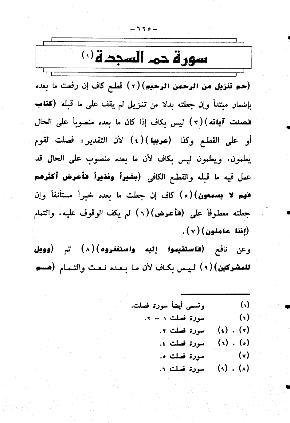 {حم تنزيل من الرحمن الرحيم} قطع كاف إن رفعت ما بعده بإضمار مبتدا وإن جعلته بدلا من تنزيل لم يقف على ما قبله {كتاب فصلت آياته} ليس بكاف إذا كان ما بعده منصوبا على الحال أو على القطع وكذا {عربيا} لأن التقدير: فصلت لقوم يعلمون، ويعلمون ليس بكاف لأن ما بعده منصوب على الحال قد عمل فيه ما قبله والقطع الكافي {بشيرا ونذيرا فأعرض أكثرهم فهم لا يسمعون} كاف إن جعلت ما بعده خبرا مستأنفا وإن جعلته معطوفا على {فأعرض} لم يكف الوقوف عليه، والتمام {إننا عاملون}.