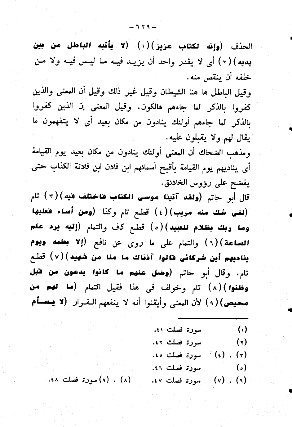 قال أبو حاتم {ولقد آتينا موسى الكتاب فاختلف فيه} تام {لفي شك منه مريب} قطع تام وكذا {ومن أساء فعليها وما ربك بظلام للعبيد} قطع كاف والتمام {إليه يرد علم الساعة} والتمام على ما روى عن نافع {إلا بعلمه ويوم يناديهم أين شركائي قالوا آذناك ما منا من شهيد} قطع تام، وقال أبو حاتم {وضل عنهم ما كانوا يدعون من قبل وظنوا} تام وخولف في هذا فقيل التمام {ما لهم من محيص} لأن المعنى وأيقنوا أنه لا ينفعهم الفرار {لا يسأم