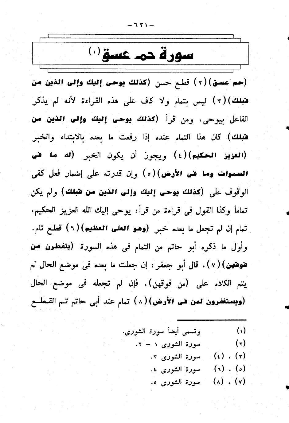 {حم عسق} قطع حسن {كذلك يوحي إليك وإلى الذين من قبلك} ليس بتمام ولا كاف على هذه القراءة لأنه لم يذكر فاعل بيوحي، ومن قرأ {كذلك يوحي إليك وإلى الذين من قبلك} كان هذا التمام عنده إذا رفعت ما بعده بالابتداء والخبر {العزيز الحكيم} ويجوز أن يكون الخبر {له ما في السموات وما في الأرض} وإن قدرته على إضمار فعل كفى الوقوف على {كذلك يوحي إليك وإلى الذين من قبلك} ولم يكن تماما وكذا القول في قراءة من قرأ: يوحي إليك الله العزيز الحكيم، تمام إن لم تجعل ما بعده خبر {وهو العلي العظيم} قطع تام. وأول ما ذكره أبو حاتم من التمام في هذه السورة {يتفطرن من فوقهن}، قال أبو جعفر: إن جعلت ما بعده في موضع الحال لم يتم الكلام على {من فوقهن}، فإن لم تجعله في موضع الحال {ويستغفرون لمن في الأرض} تمام عند أبي حاتم تم القطع