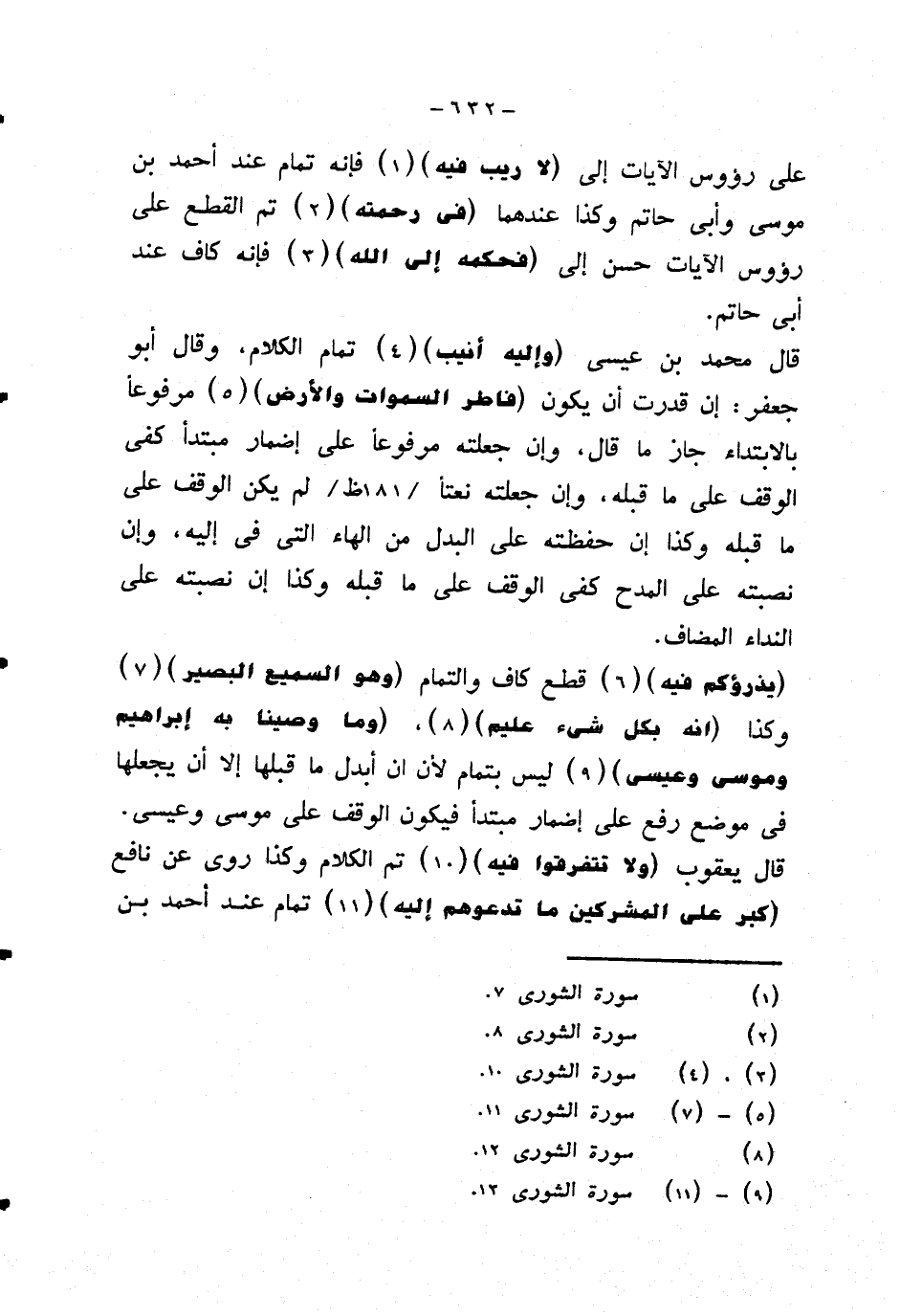 على رؤوس الآيات إلى {لا ريب فيه} فإنه تمام عند أحمد بن موسى وأبي حاتم وكذا عندهما {في رحمته} تم القطع على رؤوس الآيات حسن إلى {فحكمه إلى الله} فإنه كاف عند أبي حاتم.
