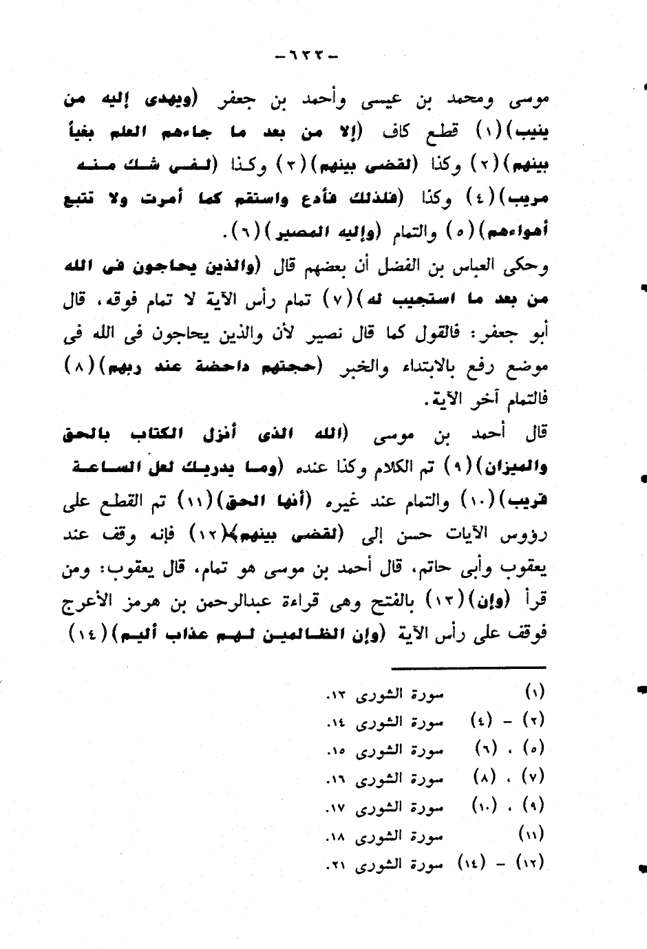 قال أحمد بن موسى {الله الذي أنزل الكتاب بالحق والميزان} تم الكلام وكذا عنده {وما يدريك لعل الساعة قريب} والتمام عند غيره {أنها الحق} تم القطع على رؤوس الايات حسن إلى {لقضى بينهم} فإنه وقف عند يعقوب وأبي حاتم، قال أحمد بن موسى هو تمام، قال يعقوب: ومن قرا {وإن} بالفتح وهي قراءة عبد الرحمن بن هرمز الأعرج فوقف على رأس الاية {وإن الظالمين لهم عذاب أليم}.