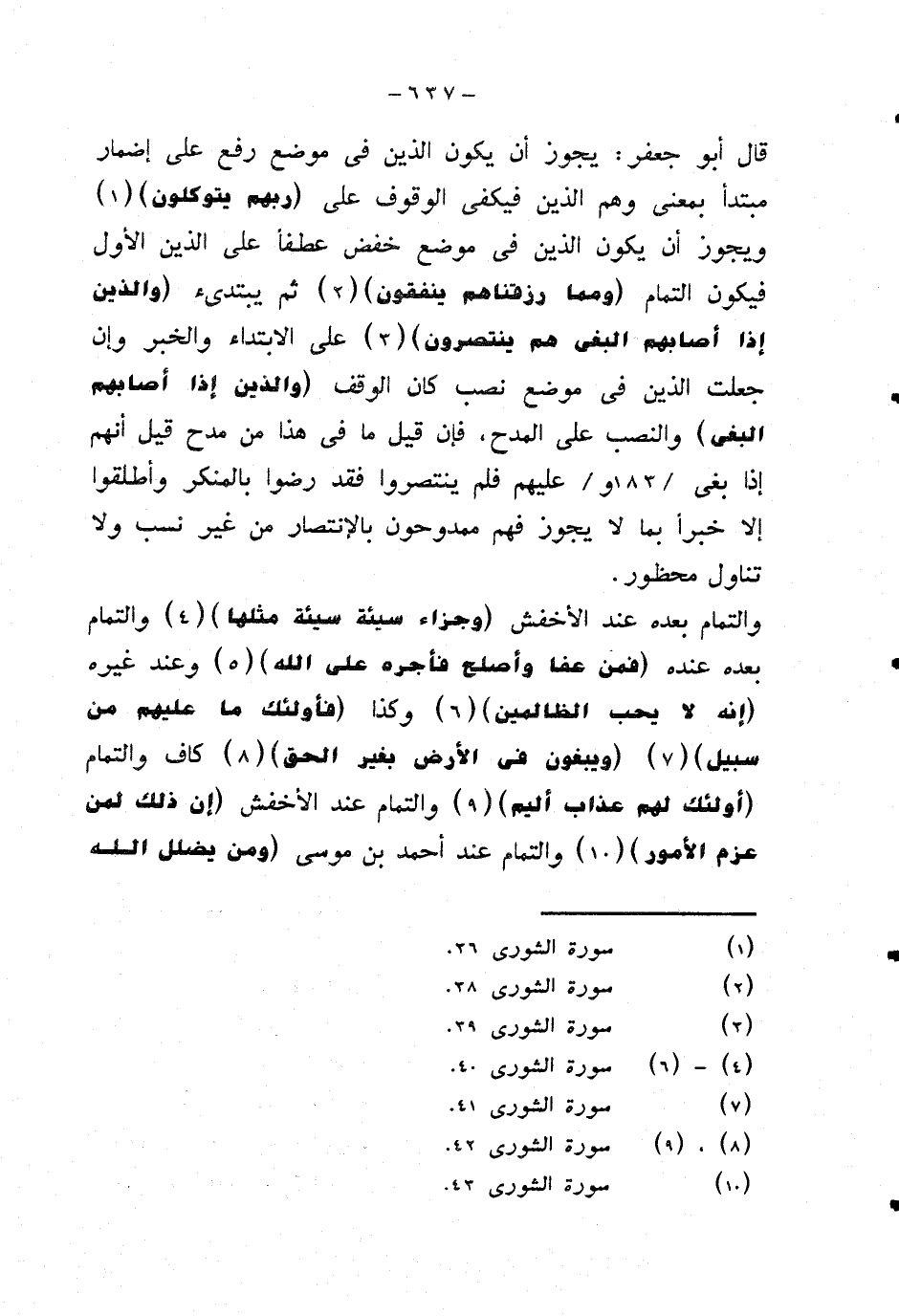 والتمام بعده عند الأخفش {وجزاء سيئة سيئة مثلها} والتمام بعده عنده {فمن عفا وأصلح فأجره على الله} وعند غيره {إنه لا يحب الظالمين} وكذا {فأولئك ما عليهم من سبيل} {ويبغون في الأرض بغير الحق} كاف والتمام {أولئك لهم عذاب أليم} والتمام عند الأخفش {إن ذلك لمن عزم الأمور} والتمام عند أحمد بن موسى {ومن يضلل الله