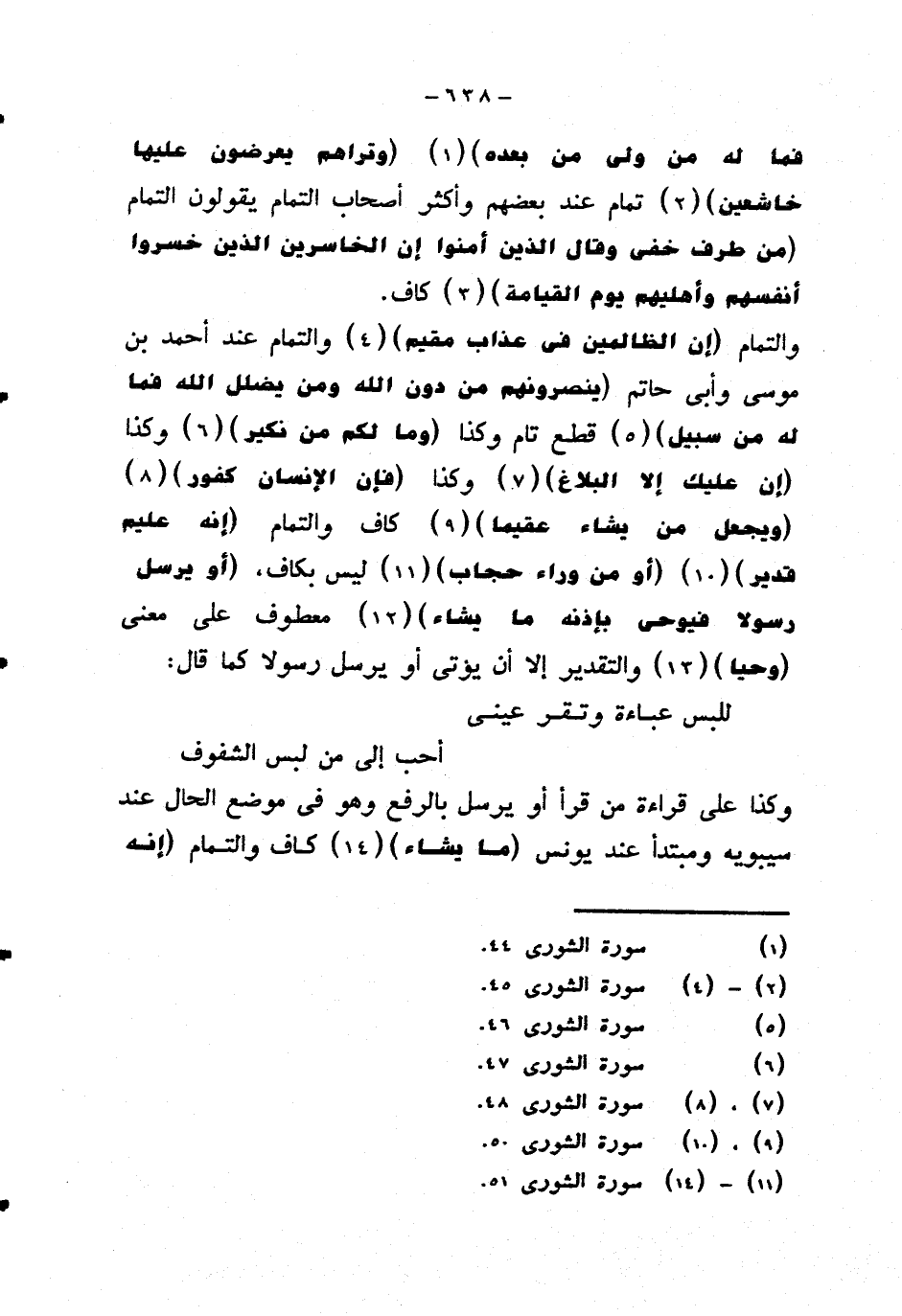 والتمام {إن الظالمين في عذاب مقيم} والتمام عند أحمد بن موسى وأبي حاتم {ينصرونهم من دون الله ومن يضلل الله فما له من سبيل} قطع تام وكذا {وما لكم من نكير} وكذا {إن عليك إلا البلاغ} وكذا {فإن الإنسان كفور} {ويجعل من يشاء عقيما} كاف والتمام {إنه عليم قدير} {أو من وراء حجاب} ليس بكاف، {أو يرسل رسولا فيوحي بإذنه ما يشاء} معطوف على معنى {وحيا} والتقدير إلا أن يؤتى أو يرسل رسولا كما قال: