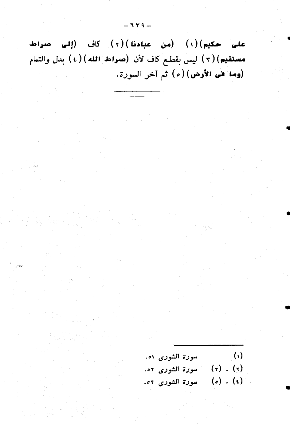 عليٌّ حكيم} {من عبادنا} كاف {إلى صراط مستقيم} ليس بقطع كاف لأن {صراط الله} بدل والتمام {وما في الأرض} ثم آخر السورة.