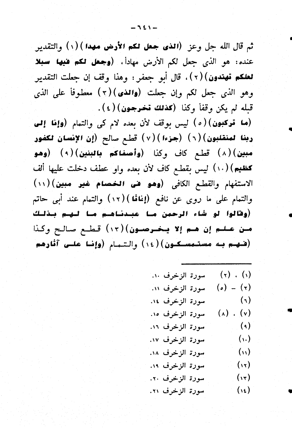 {ما تركبون} ليس بوقف لأن بعده لام كي والتمام {وإنا إلى ربنا لمنقلبون} {جزءا} قطع صالح {إن الإنسان لكفور مبين} قطع كاف وكذا {وأصفاكم بالبنين} {وهو كظيم} ليس بقطع كاف لأن بعده واو عطف دخلت عليها ألف الاستفهام والقطع الكافي {وهو في الخصام غير مبين} والتمام على ما روى عن نافع {إناثا} والتمام عند أبي حاتم {وقالوا لو شاء الرحمن ما عبدناهم ما لهم بذلك من علم إن هم إلا يخرصون} قطع صالح وكذا {فهم به مستمسكون} والتمام {وإنا على آثارهم