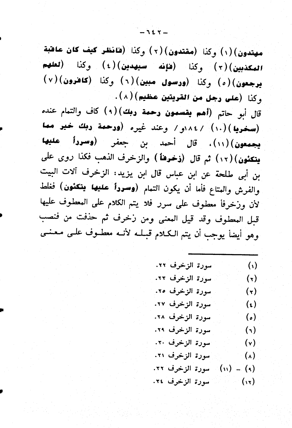 قال أبو حاتم {أهم يقسمون رحمة ربك} كاف والتمام عنده {سخريا} وعند غيره {ورحمة ربك خير مما يجمعون} قال أحمد بن جعفر {وسررا عليها يتكئون} ثم قال {زخرفا} والزخرف الذهب فكذا روى على بن أبي طلحة عن ابن عباس قال ابن يزيد: الزخرف آلات البيت والفرش والمتاع فأما أن يكون التمام {وسررا عليها يتكئون} فغلط لأن وزخرفا معطوف على سرر فلا يتم الكلام على المعطوف عليها قبل المعطوف وقد قيل المعنى ومن زخرف ثم حذفت من فنصب وهو أيضا يوجب أن يتم الكلام قبله لأنه معطوف على معنى
