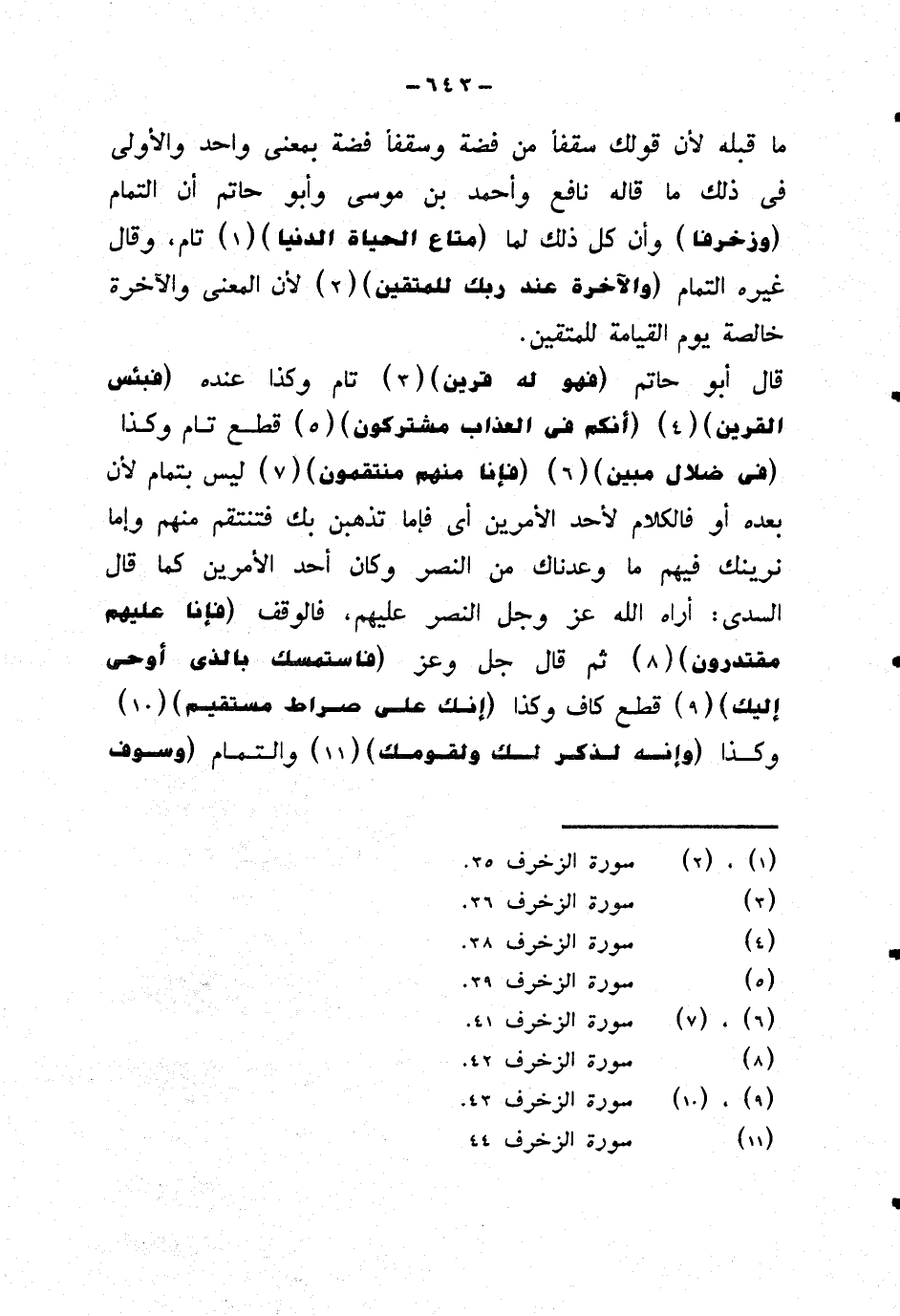ما قبله لأن قولك سقفا من فضة وسقفا فضة بمعنى واحد والأولى في ذلك ما قاله نافع وأحمد بن موسى وأبو حاتم أن التمام {وزخرفا} وأن كل ذلك لما {متاع الحياة الدنيا} تام، وقال غيره التمام {والآخرة عند ربك للمتقين} لأن المعنى والآخرة خالصة يوم القيامة للمتقين.