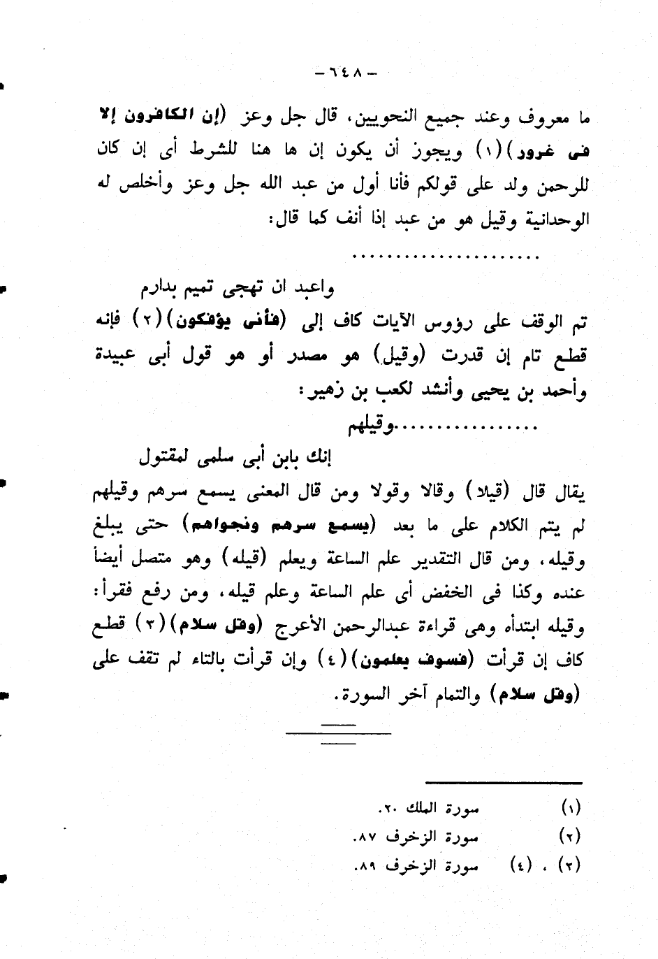 يقال قال {قيلا} وقالا وقولا ومن قال المعنى يسمع سرهم وقيلهم لم يتم الكلام على ما بعد {يسمع سرهم ونجواهم} حتى يبلغ وقيله، ومن قال التقدير علم الساعة ويعلم {قيله} وهو متصل أيضا عنده وكذا في الخفض أي علم الساعة وعلم قيله، ومن رفع فقرأ: وقيله ابتدأه وهي قراءة عبد الرحمن الأعرج {وقل سلام} قطع كاف إن قرأت {فسوف يعلمون} وإن قرأت بالتاء لم تقف على {وقل سلام} والتمام آخر السورة.