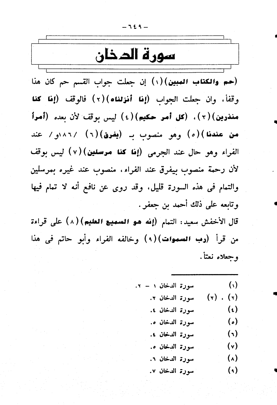 {حم والكتاب المبين} إن جعلت جواب القسم حم كان هذا وقفا، وإن جعلت الجواب {إنا أنزلناه} فالوقف {إنا كنا منذرين} {كل أمر حكيم} ليس بوقف لأن بعده {أمرا من عندنا} وهو منصوب بـ {يفرق} عند الفراء وهو حال عند الجرمي {إنا كنا مرسلين} ليس بوقف لأن رحمة منصوب بيفرق عند الفراء، منصوب عند غيره بمرسلين والتمام في هذه السورة قليل، وقد روى عن ناع أنه لا تمام فيها وتابعه على ذلك أحمد بن جعفر.