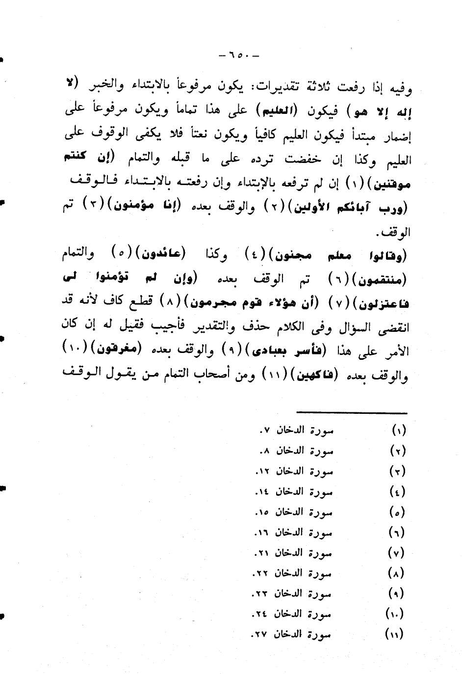 {وقالوا معلم مجنون} وكذا {عائدون} والتمام {منتقمون} تم الوقف بعده {وإن لم تؤمنوا لي فاعتزلون} {أن هؤلاء قوم مجرمون} قطع كاف لأنه قد انقضى السؤال وفي الكلام حذف والتقدير فأجيب فقيل له إن كان الأمر على هذا {فأسر بعبادي} والوقف بعده {مغرقون} والوقف بعده {فاكهين} ومن أصحاب التمام من يقول الوقف