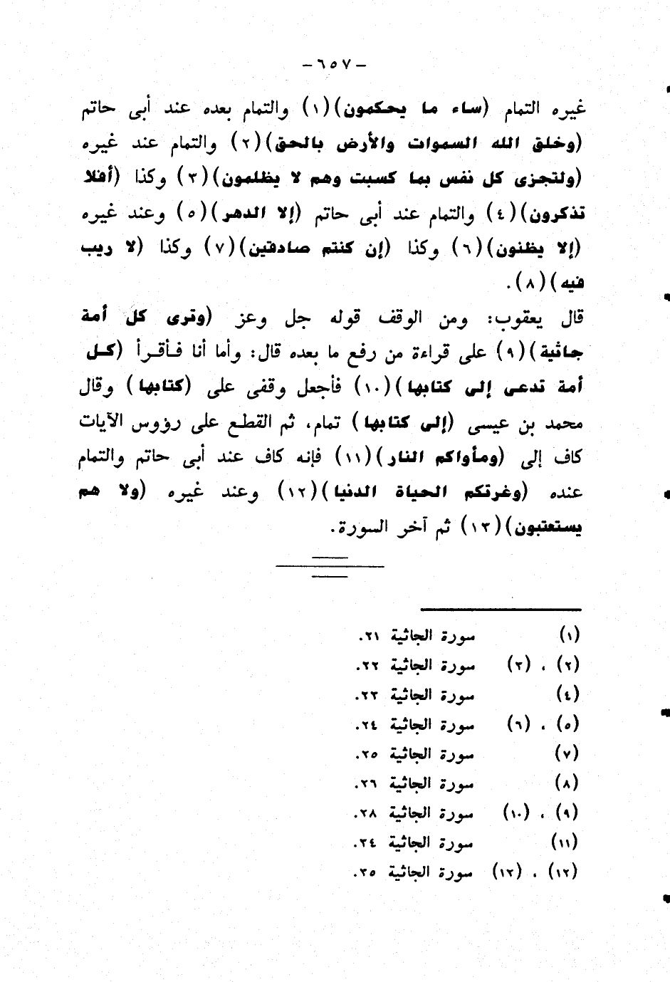 قال يعقوب: ومن الوقف قوله جل وعز {وترى كل أمة جاثية} على قراءة من رفع ما بعده قال: وأما أنا فأقرأ {كل أمة تدعى إلى كتابها} فأجعل وقف على {كتابها} وقال محمد بن عيسى {إلى كتابها} تمام، ثم القطع على رؤوس الايات كاف إلى {ومأواكم النار} فإنه كاف عند أبي حاتم والتمام عنده {وغرتكم الحياة الدنيا} وعند غيره {ولا هم يستعتبون} ثم آخر السورة.