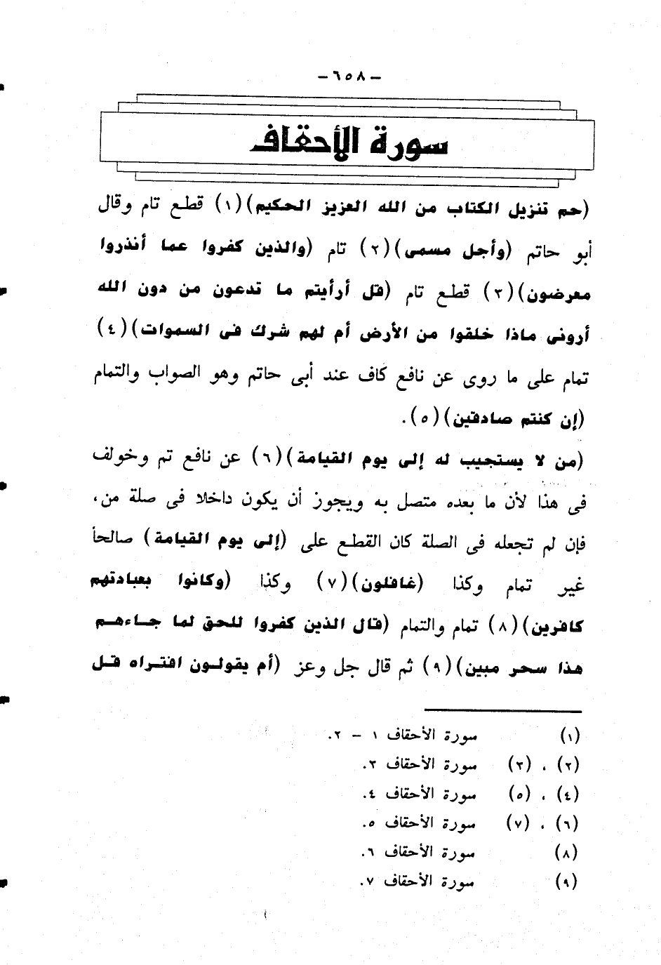 {حم تنزيل الكتاب من الله العزيز الحكيم} قطع تام وقال أبو حاتم {وأجل مسمى} تام {والذين كفروا عما أنذروا معرضون} قطع تام {قل أرأيتم ما تدعو} من دون الله أروني ماذا خلقوا من الأرض أم لهم شرك في السموات تمام على ما روى عن نافع كاف عند أبي حاتم وهو الصواب والتمام {إن كنتم صادقين}.
