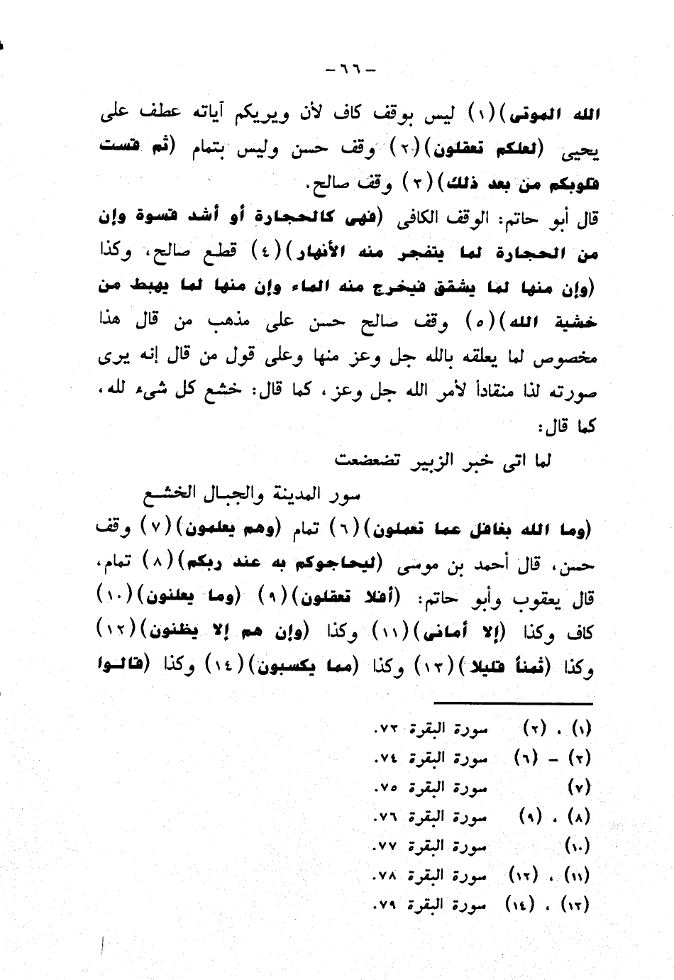 قال أبو حاتم: الوقف الكافي {فهي كالحجارة أو أشد قسوة وإن من الحجارة لما يتفجر منه الأنهار} قطع صالح، وكذا {وإن منها لما يشقق فيخرج منه الماء وإن منها لما يهبط من خشية الله} وقف صالح حسن على مذهب من قال هذا مخصوص لما يعلقه بالله جل وعز منها وعلى قول من قال إنه يرى صورته لذا منقادًا لأمر الله جل وعز، كما قال: خشع كل شيء لله، كما قال: