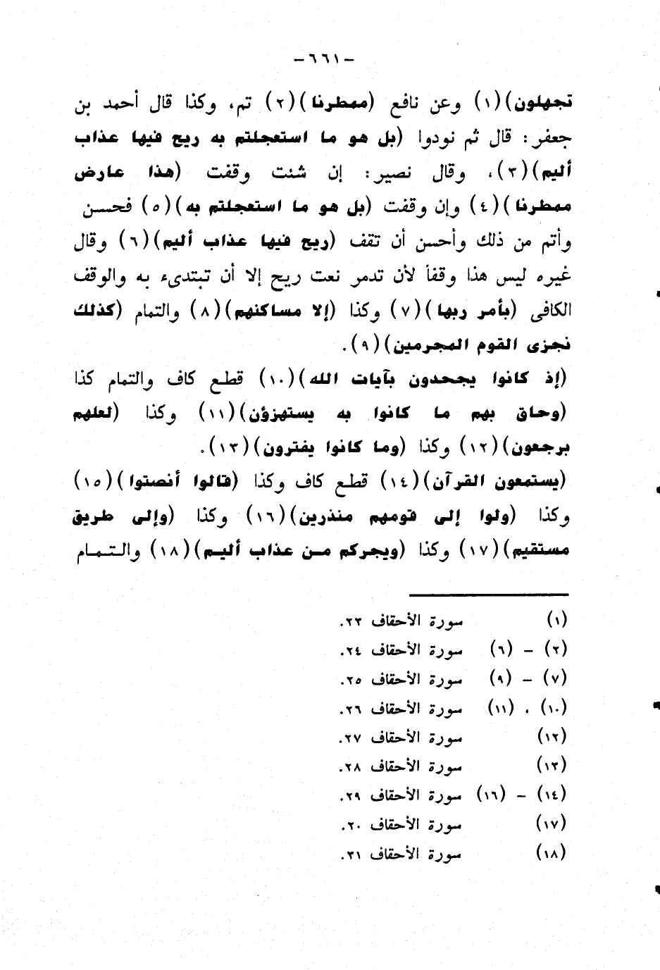 تجهلون} وعن نافع {ممطرنا} تم، وكذا قال أحمد بن جعفر: قال ثم نودوا {بل هو ما استعجلتم به ريح فيها عذاب أليم} وقال نصير: إن شئت وقفت {هذا عارض ممطرنا} وإن وقفت {بل هو ما استعجلتم به} فحسن وأتم من ذلك وأحسن أن تقف {ريح فيها عذاب أليم} وقال غيره ليس هذا وقفا لأن تدمر نعت ريح إلا أن تبتديء به اولوقف الكافي {بامر ربها} وكذا {إلا مساكنهم} والتمام {كذلك نجزي القوم المجرمين} ..