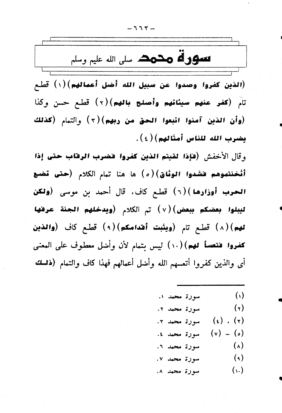 وقال الأخفش {فإذا لقيتم الذين كفروا فضرب الرقاب حتى إذا أثخنتموهم فشدوا الوثاق} ها هنا تمام الكلام {حتى تضع الحرب أوزارها} قطع كاف، قال أحمد بن موسى {ولكن ليبلوا بعضكم ببعض} تم الكلام {ويدخلهم الجنة عرفها لهم} قطع تام {ويثبت أقدامكم} قطع كاف {والذين كفروا فتعسا لهم} ليس بتمام لأن واضل معطوف على المعنى أي والذين كفروا أتعسهم الله وأضل أعمالهم فهذا كاف والتمام {ذلك}