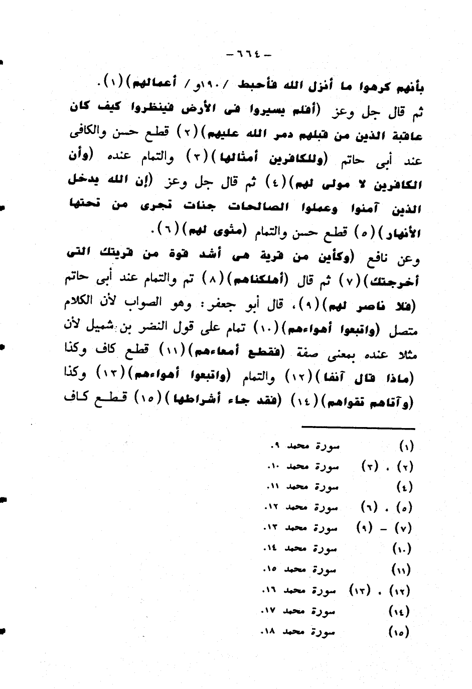 وعن نافع {وكأين من قرية هي أشد قوة من قريتك التي أخرجتك} ثم قال {أهلكناهم} تم والتمام عند أبي حاتم {فلا ناصر لهم} قال أبو جعفر: وهو الصواب لأن الكلام متصل {واتبعوا أهواءهم} تمام على قول النضر بن شميل لأن مثلا عنده بمعنى صفة {فقط أمعاءهم} قطع كاف وكذا {ماذا قال آنفا} والتمام {واتبعوا أهواءهم} وكذا {وآتاهم تقواهم} {فقد جاء أشراطها} قطع كاف