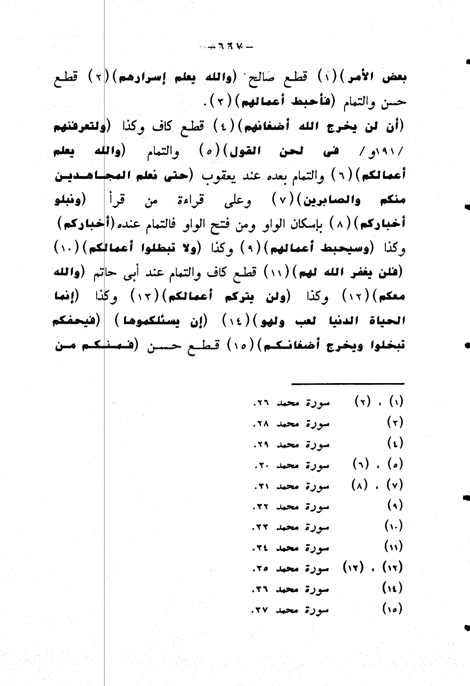 {أن لن يخرج الله أضغانهم} قطع كاف وكذا {ولتعرفنهم في لحن القول} والتمام {والله يعلم أعمالكم} والتمام بعده عند يعقوب {حتى نعلم المجاهدين منكم والصابرين} وعلى قراءة من قرأ {ونبلو أخباركم} بإسكان الواو ومن فتح الواو فالتمام عنده {أخباركم} وكذا {وسيحبط أعمالهم} وكذا {ولا تبطلوا أعمالكم} {فلن يغفر الله لهم} قطع كاف والتمام عند أبي حاتم {والله معكم} وكذا {ولن يتركم اعمالكم} وكذا {إنما الحياة الدنيا لعب ولهو} {إن يسئلكموها} {فيحفكم تبخلوا ويخرج أضغانكم} قطع حسن {فمنكم من