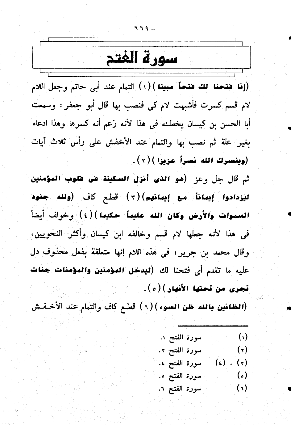 {إنا فتحنا لك فتحا مبينا} التمام عند أبي حاتم وجعل اللام لام قسم كسرت فأشبهت لام كي فنصب بها قال ابو جعفر: وسمعت ابا الحسن بن كيسان يخطئه في هذا لأنه زعم أنه كسرها وهذا ادعاء بغير علة ثم نصب بها والتمام عند الأخفش على رأس ثلاث آيات {وينصرك الله نصرا عزيزا}.