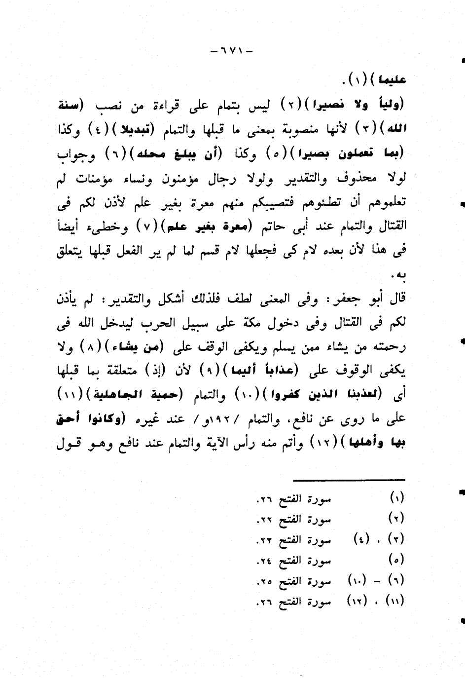 {وليا ولا نصيرا} ليس بتمام على قراءة من نصب {سنة الله} لأنها منصوبة بمعنى ما قبلها والتمام {تبديلا} وكذا {بما تعملون بصيرا} وكذا {أن يبلغ محله} وجواب لولا محذوف والتقدير ولولا رجال مؤمنون ونساء مؤمنات لم تعلموهم أن تطئوهم فتصيبكم منهم معرة بغير علم لأذن لكم في القتال والتمام عند أبي حاتم {معرة بغير علم} وخطيء أيضا في هذا لأن بعده لام كي فجعلها لام قسم لما لم ير الفعل قبلها يتعلق به.