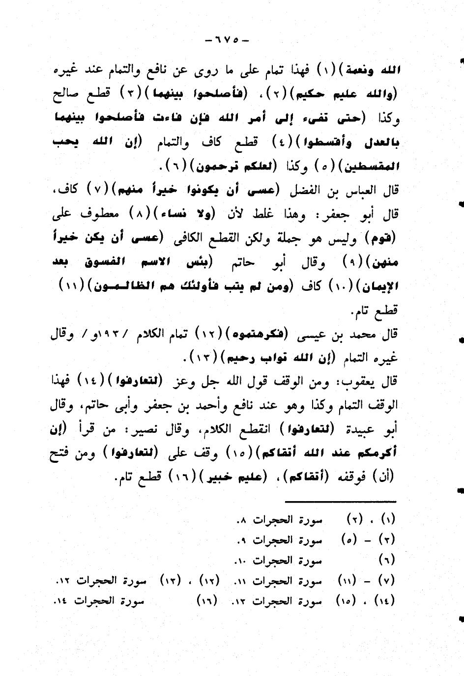 الله ونعمة} فهذا تمام على ما روى عن نافع والتمام عند غيره {والله عليم حكيم} {فاصلحوا بينهما} قطع صالح وكذا {حتى تفيء إلى أمر الله فإن فاءت فأصلحوا بينهما بالعدل وأقسطوا} قطع كاف والتمام {إن الله يحب المقسطين} وكذا {لعلكم ترحمون}.