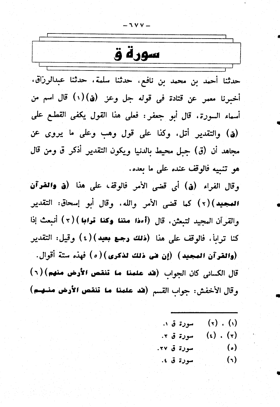 حدثنا أحمد بن محمد بن نافع، حدثنا سلمة، حدثنا عبد الرزاق، أخبرنا معمر عن قتادة في قوله جل وعز {ق} قال اسم من أسماء السورة: قال أبو جعفر: فعلى هذا القول يكفي القطع على {ق} والتقدير أتل، وكذا على قول وهب وعلى ما يروى عن مجاهد أن {ق} جبل محيط بالدنيا ويكون التقدير أذكر ق ومن قال هو تنبيه قالوقف عنده على ما بعده.