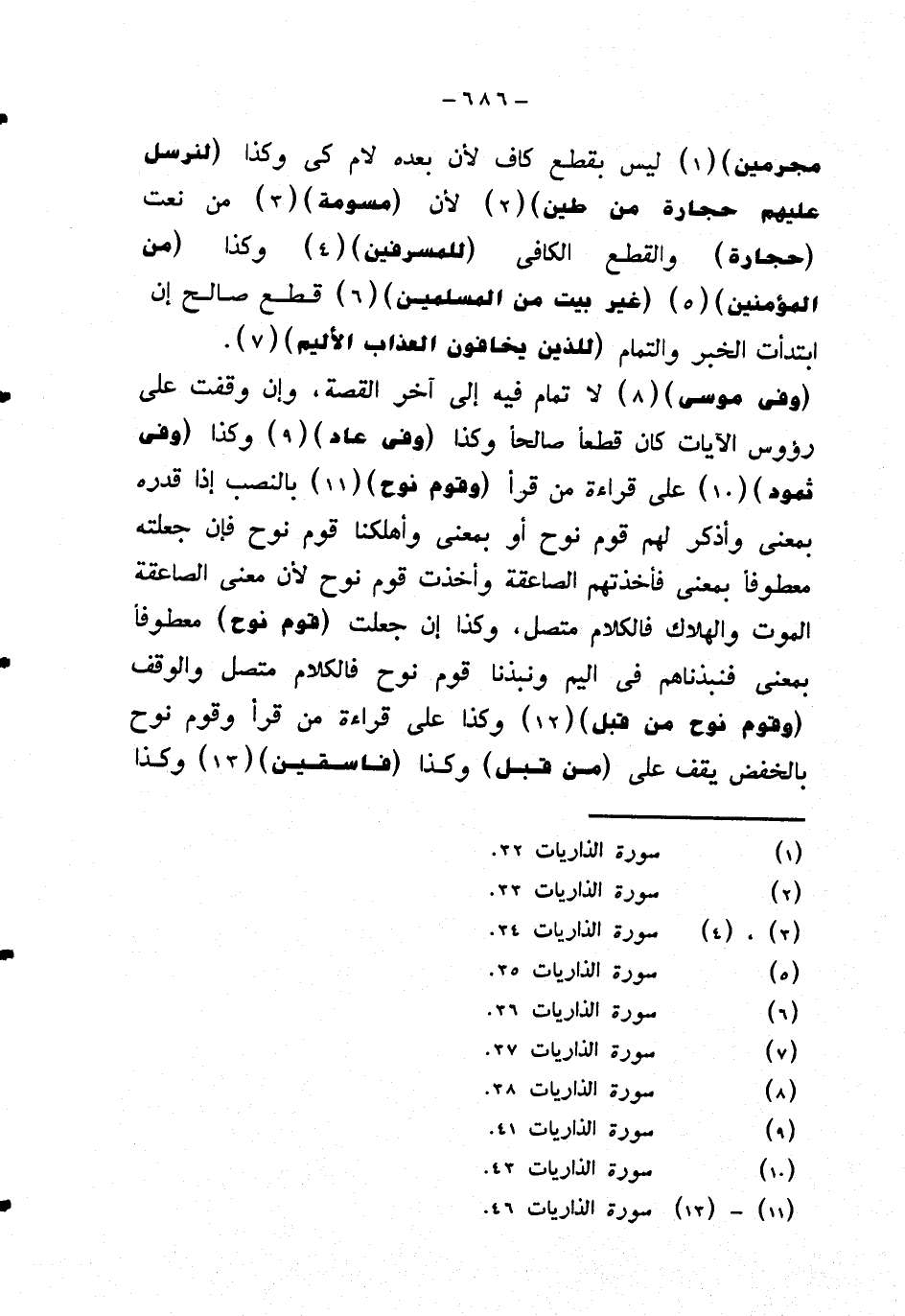 مجرمين} ليس بقطع كاف لأن بعده لام كي وكذا {لنرسل عليهم حجارة من طين} لأن {مسومة} من نعت {حجارة} والقطع الكافي {للمسرفين} وكذا {من المؤمنين} {غير بيت من المسلمين} قطع صالح إن ابتدأت الخبر والتمام {للذين يخافون العذاب الأليم}.