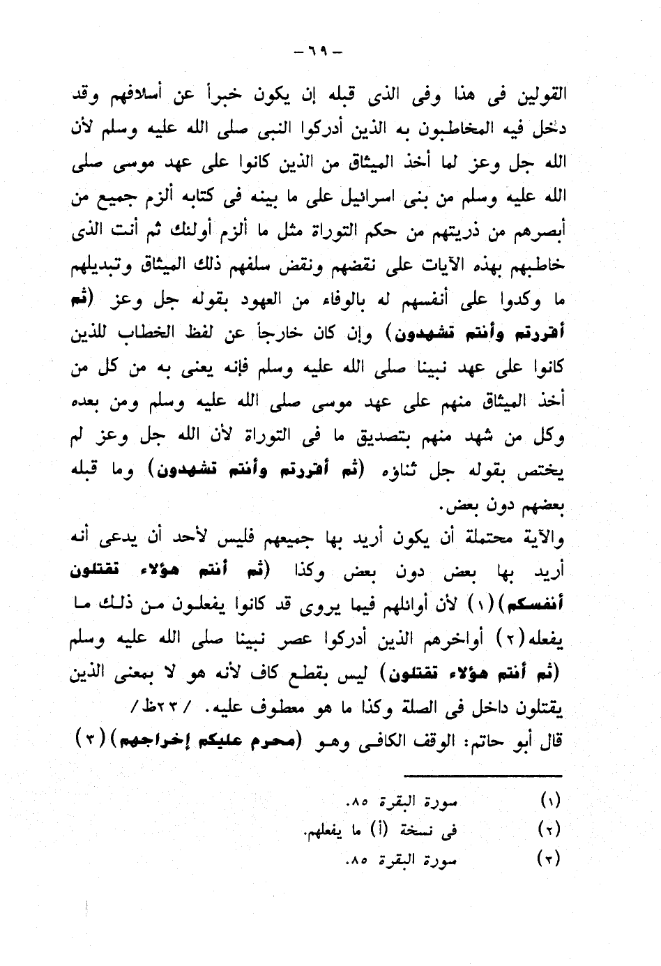 والآية محتملة أن يكون أريد بها جميعهم فليس لأحد أن يدعى أنه أريد بها بعض دون بعض وكذا {ثم أنتم هؤلاء تقتلون أنفسكم} لأن أوائلهم فيما يروى قد كانوا يفعلون من ذلك ما يفعله أواخرهم الذين أدركوا عصر نبينا صلى الله عليه وسلم (ثم أنتم هؤلاء تقتلون) ليس بقطع كاف لأنه هو لا بمعنى الذين يقتلون داخل في الصلة وكذا ما معطوف عليه.