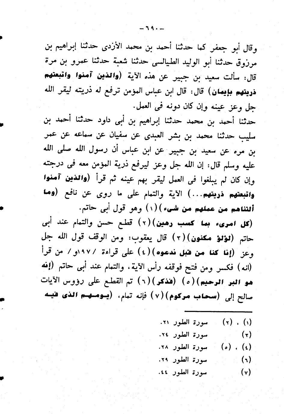 وقال أبو جعفر كما حدثنا أحمد بن محمد الأزدي حدثنا إبراهيم بن مرزوق حدثنا أبو الوليد الطيالسي حدثنا شعبة حدثنا عمرو بن مرة قال: سألت سعيد بن جبير عن هذه الآية {والذين آمنوا واتبعتهم ذريتهم بإيمان} قال: قال ابن عباس المؤمن ترفع له ذريته ليقر الله جل وعز عينه وإن كان دونه في العمل.