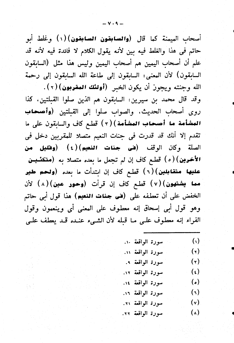 وقد قال محمد بن سيرين: السابقون هم الذين صلوا القبلتين، كذا روى أصحاب الحديث، والصواب صلوا إلى القبلتين {وأصحاب المشامة ما أصحاب المشأمة} قطع كاف والسابقون على ما تقدم إلا أنك قد قدرت في جنات النعيم متصلا للمقربين دخل في الصلة وكان الوقف {في جنات النعيم} {وقليل من الآخرين} قطع كاف إن لم تجعل ما بعده متصلا به {متكئين عليها متقابلين} قطع كاف إن ابتدأت ما بعده {ولحم طير مما يشتهون} قطع كاف إن قرأت {وحور عين} لأن الخفض على أن تعطفه على {في جنات النعيم} هذا قول أبي حاتم وهو قول أبي إسحاق إنه معطوف على المعنى أي وينعمون وقول الفراء إنه معطوف على ما قبله لأن الشيء عند قد يعطف على