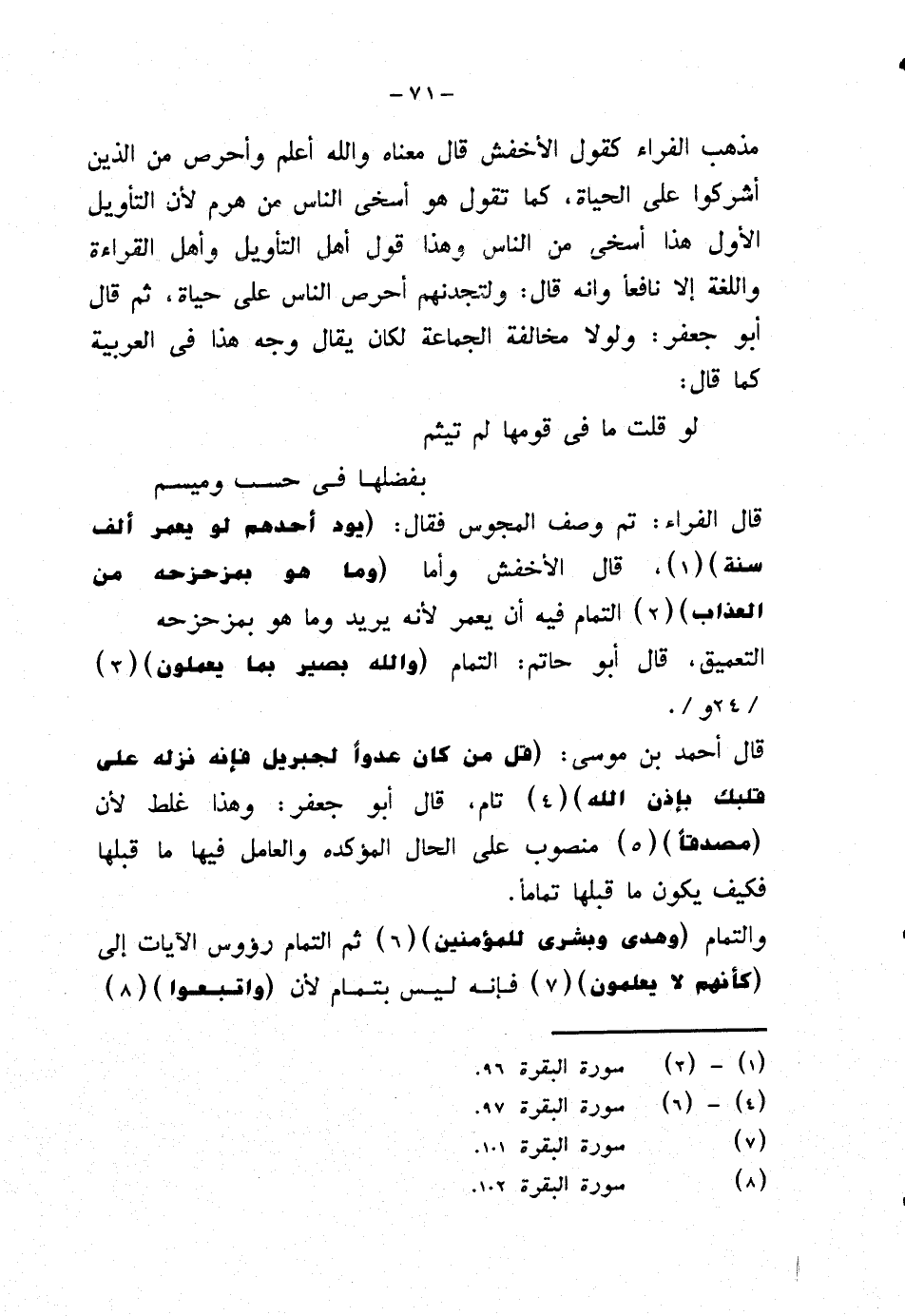 مذهب الفراء كقول الأخفش قال معناه والله أعلم وأحرص من الذين أشركوا على الحياة، كما تقول هو أسخى الناس من هرم لأن التأويل الأولى هذا أسخى من الناس، وهذا قول أهل التأويل وأهل القراءة واللغة إلا نافعًا وأنه قال: ولتجدنهم أحرص الناس على حياة، ثم قال أبو جعفر: ولولا مخالفة الجماعة لكان يقال وجه هذا في العربية كما قال: