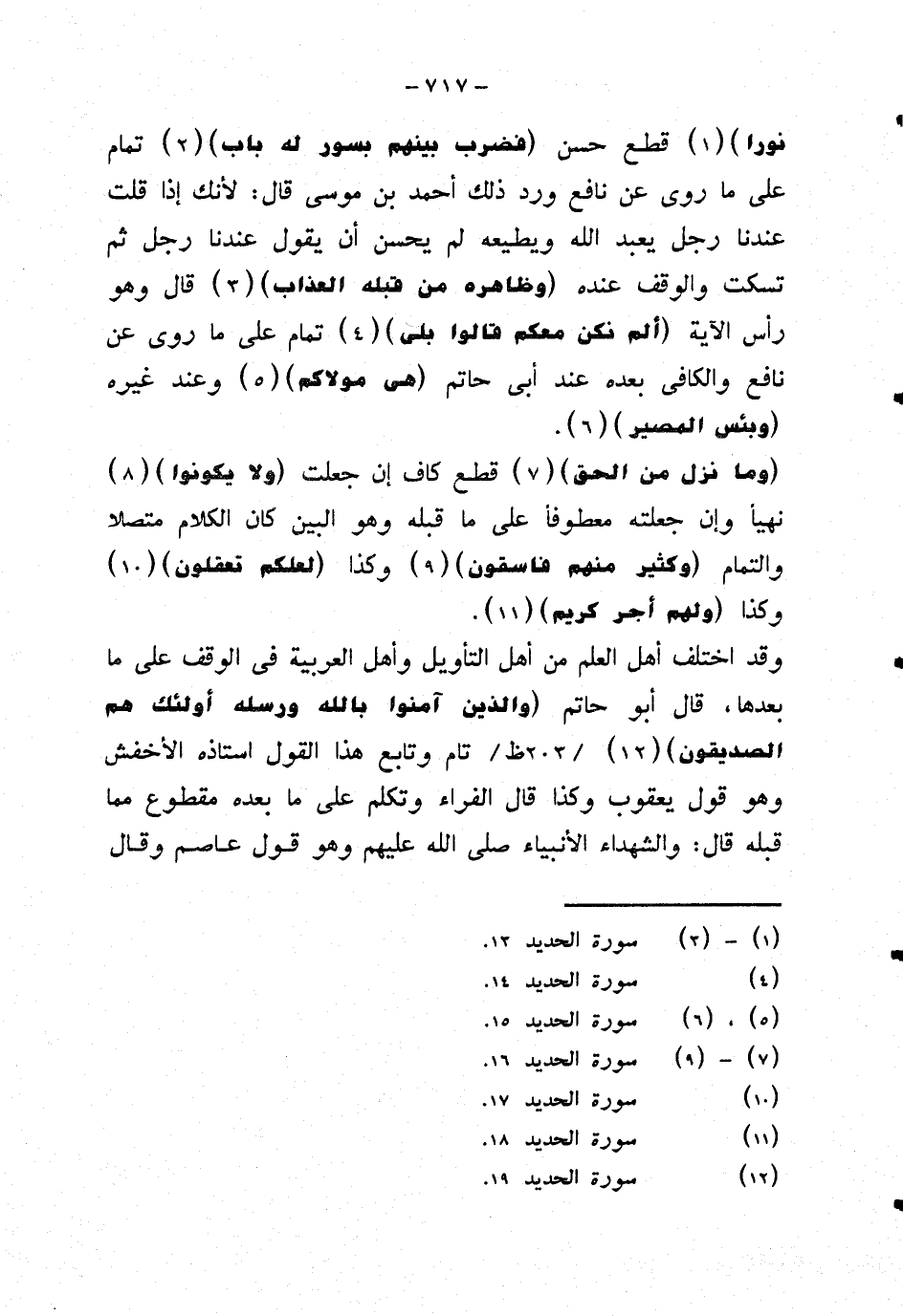 وقد اختلف أهل العلم من اهل التأويل وأهل العربية في الوقف على ما بعدها، قال أبو حاتم {والذين آمنوا بالله ورسله أولئك هم الصديقون} تام وتابع هذا القول استاذه الأخفش وهو قول يعقوب وكذا قال الفراء وتكلم على ما بعده مقطوع مما قبله قال: والشهداء الأنبياء صلى الله عليهم وهو قول عاصم وقال