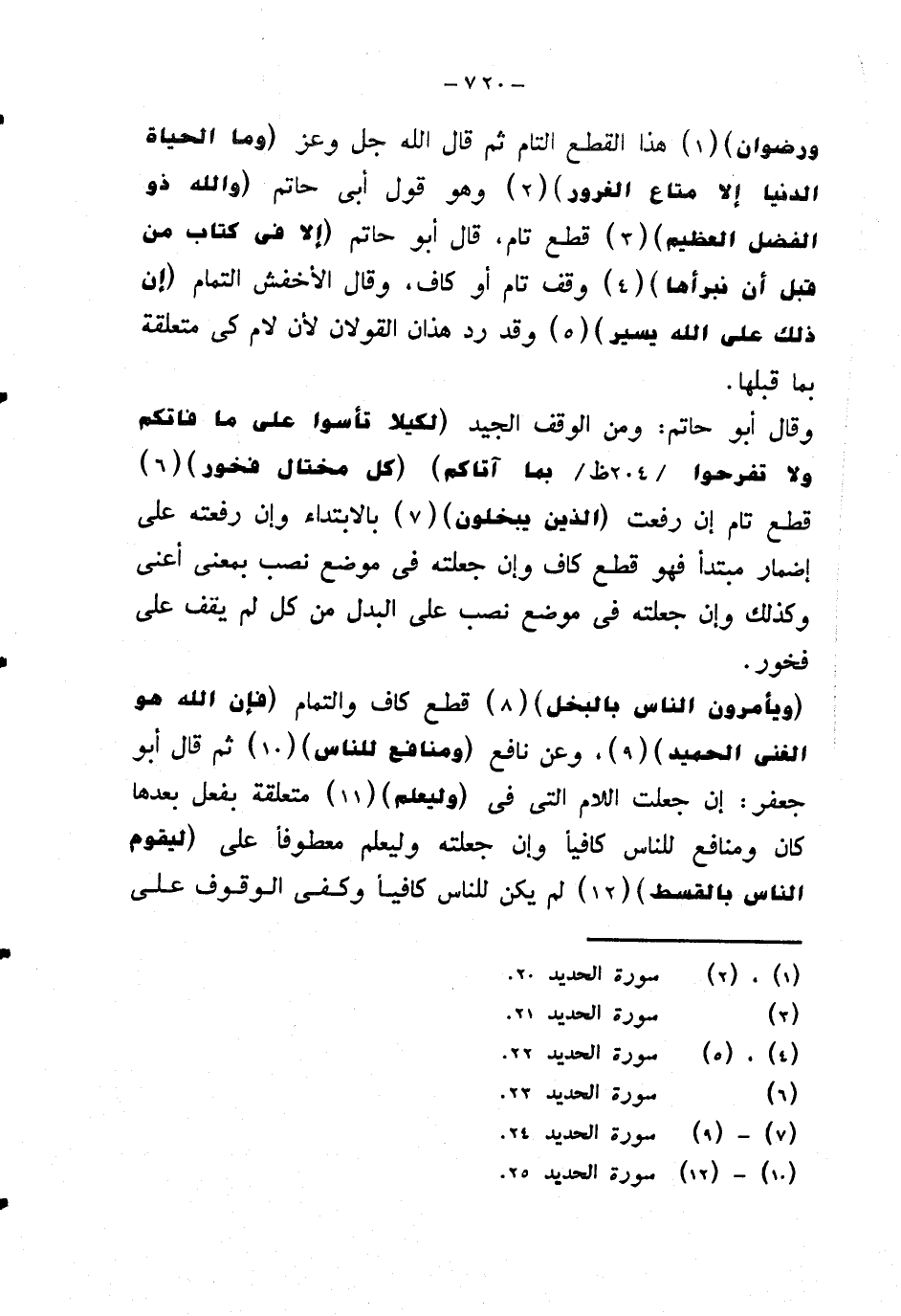 وقال أبو حاتم: ومن الوقف الجيد {ليكلا تأسوا على ما فاتكم ولا تفرحوا بما آتاكم} {كل مختل فخور} قطع تام إن رفعت {الذين يبخلون} بالابتداء وإن رفعته على إضمار مبتدأ فهو قطع كاف وإن جعلته في موضع نصب بمعنى أعني وكذلك وإن جعلته في موضع نصب على البدل من كل لم يقف على فخور.