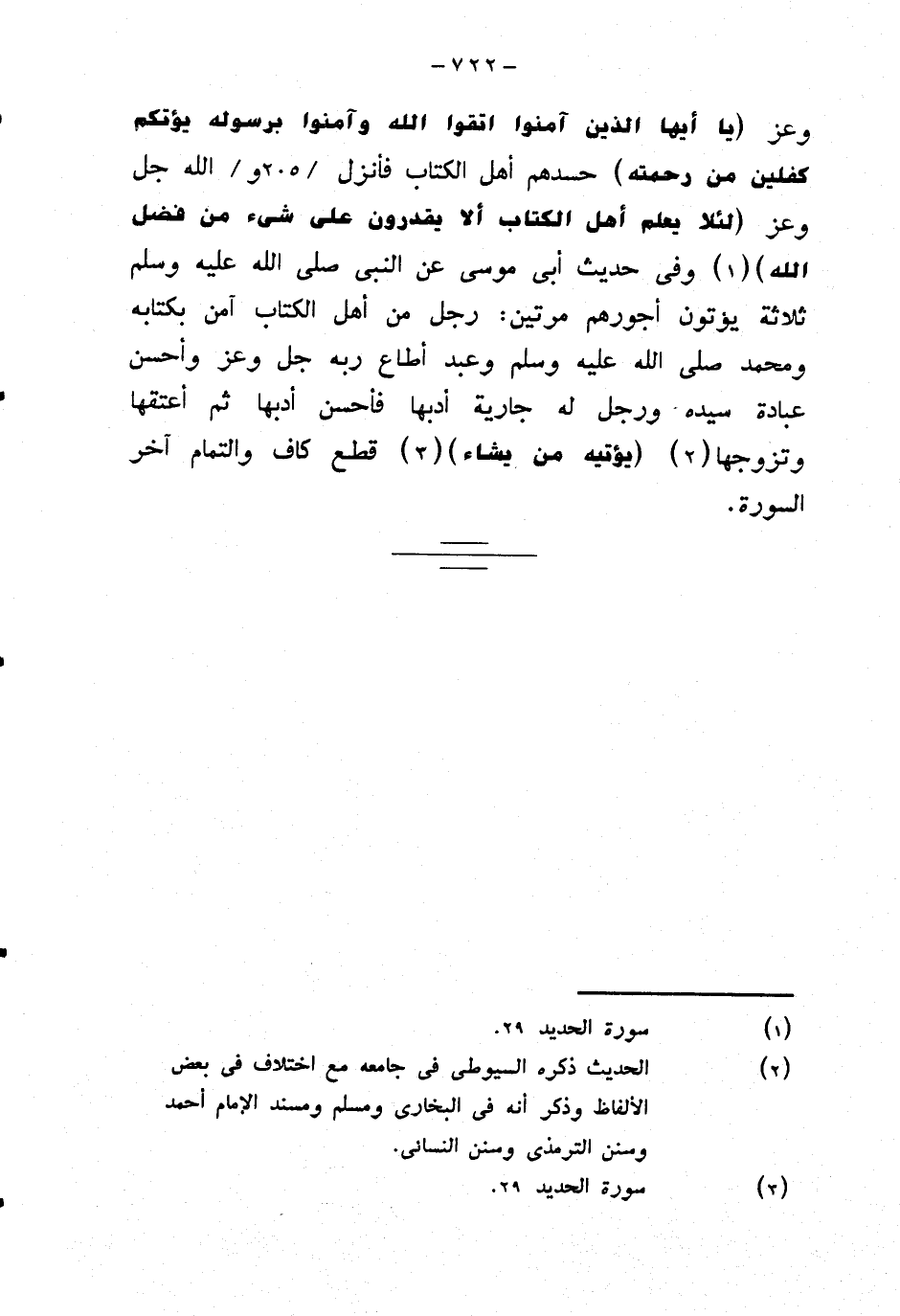 وعز {يا أيها الذين آمنوا اتقوا الله وآمنوا برسوله يؤتكم كفلين من رحمته} حدهم أهل الكتاب فأنزل الله جل وعز {لئلا يعلم أهل الكتاب ألا يقدرون على شيء من فضل الله} وفي حديث أبي موسى عن النبي صلى الله عليه وسلم ثلاثة يؤتون أجورهم مرتين: رجل من أهل الكتاب آمن بكتابه ومحمد صلى الله عليه وسلم وعبد أطاع ربه جل وعز وأحسن عبادة سيدة ورجل له جارية أدبها فأحسن أدبها ثم أعتقها وتزوجها {يؤتيه من يشاء} قطع كاف والتمام آخر السورة.