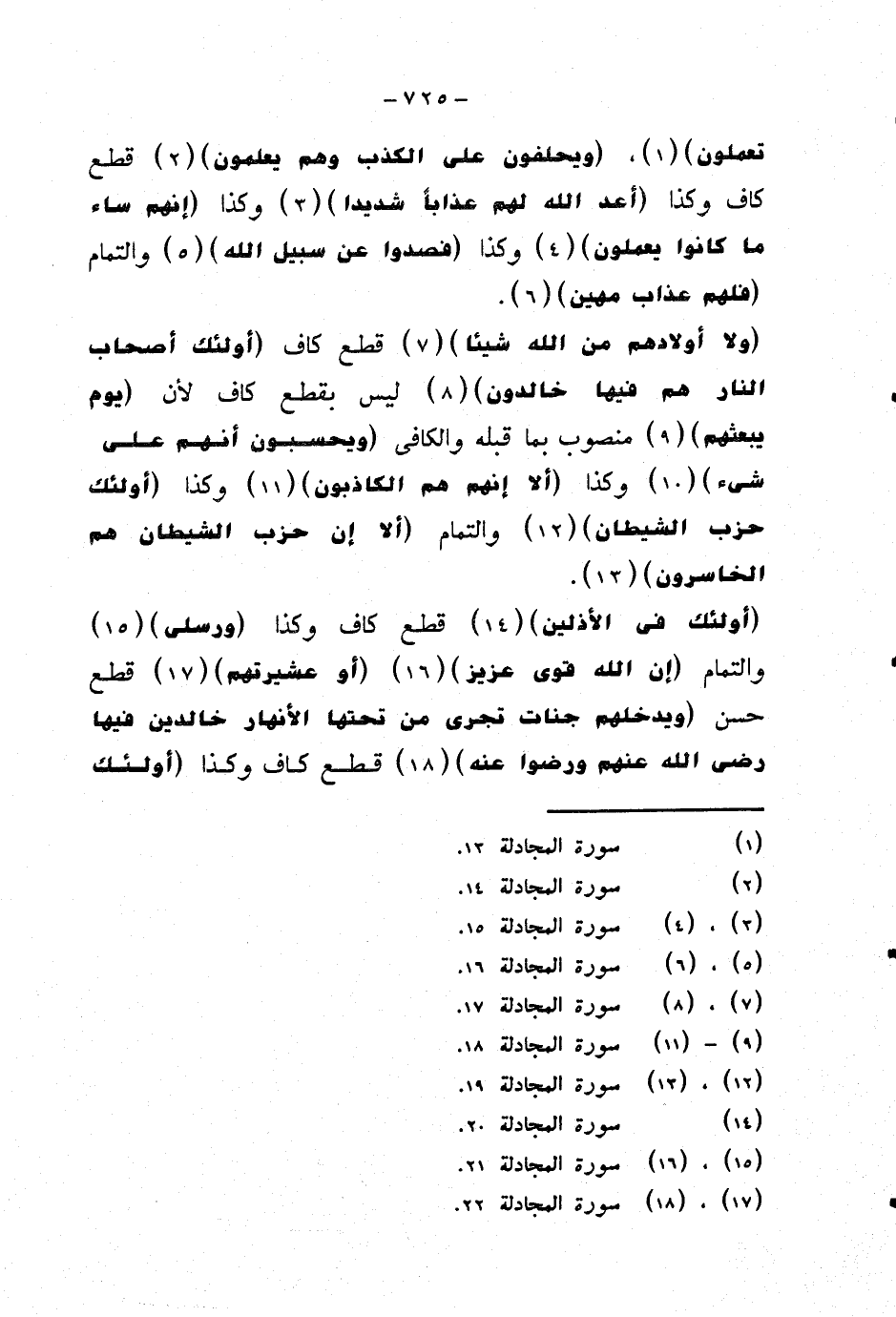 {ولا أولادهم من الله شيئا} قطع كاف {أولئك أصحاب النار هم فيها خالدون} ليس بقطع كاف لأن {يوم يبعثهم} منصوب بما قبله والكافي {ويحسبون أنهم على شيء} وكذا {ألا إنهم هم الكاذبون} وكذا {أولئك حزب الشيطان} والتمام {ألا إن حزب الشيطان هم الخاسرون}.