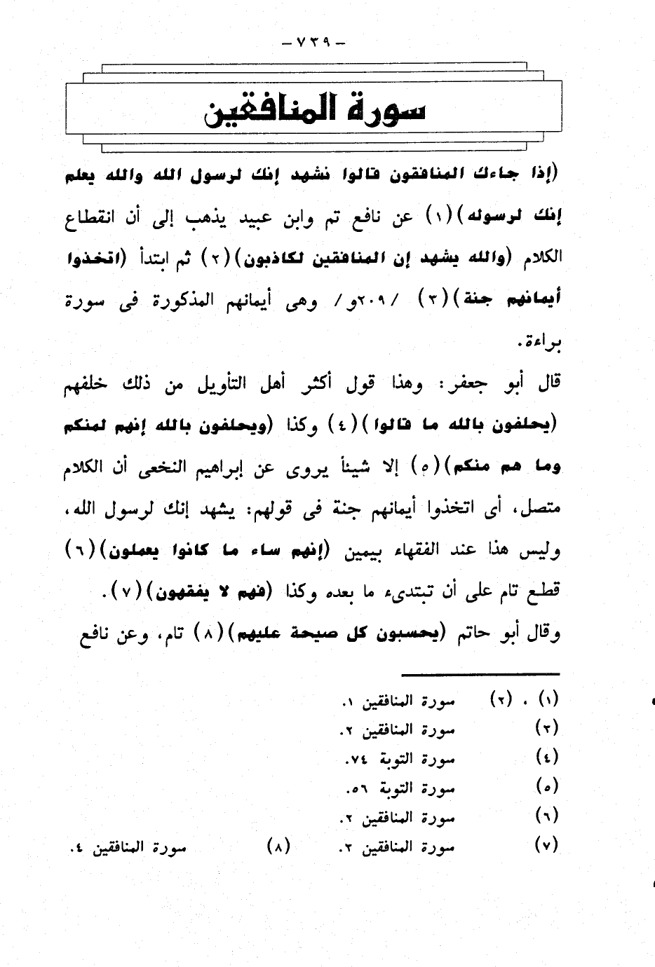 {إذا جاءك المنافقون قالوا نشهد إنك لرسول الله والله يعلم إنك لرسوله} عن نافع تم وابن عبيد يذهب إلى أن انقطاع الكلام {والله يشهد إن المنافقين لكاذبون} ثم ابتدأ {اتخذوا أيمانهم جنة} وهي أيمانهم المذكورة في سورة براءة.