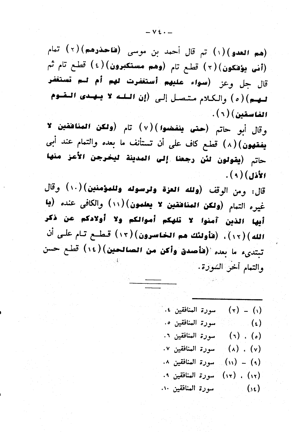 قال: ومن الوقف {ولله العزة ولرسوله وللمؤمنين} وقال غيره التمام {ولكن المنافقين لا يعلمون} والكافي عنده {يا أيها الذين آمنوا لا تلهكم أموالكم ولا أولادكم عن ذكر الله} {فأولئك هم الخاسرون} قطع تام على أن تبتديء ما بعده {فأصدق وأكن من الصالحين} قطع حسن والتمام آخر السورة.