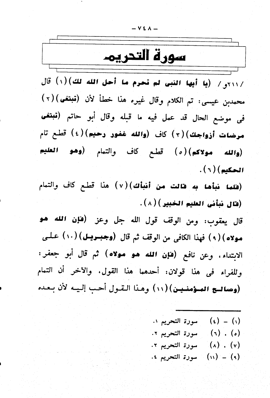 {يا أيها النبي لم تحرم ما أحل الله لك} قال محمد بن عيسى: تم الكلام وقال غيره هذا خطأ لأن {تبتغي} في موضع الحال قد عمل فيه ما قبله وقال أبو حاتم {تبتغي مرضات أزواجك} كاف {والله غفور رحيم} قطع تام {والله مولاكم} قطع كاف والتمام {وهو العليم الحكيم}.