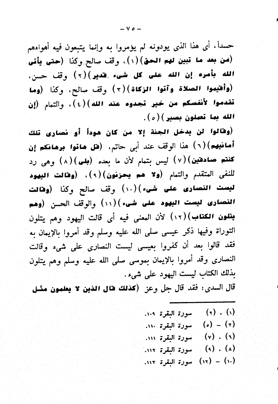 {وقالوا لن يدخل الجنة إلا من كان هودًا أو نصارى تلك أمانيهم} هذا الوقف عند أبي حاتم، {قل هاتوا برهانكم إن كنتم صادقين} ليس بتمام لأن ما بعده {بلى} وهي رد للنفي المتقدم والتمام {ولا هم يحزنون}، {وقالت اليهود ليست النصارى على شيء} وقف صالح وكذا {وقالت النصارى ليست اليهود على شيء} والوقف الحسن {وهم يتلون الكتاب} لأن المعنى فيه أي قالت اليهود وهم يتلون التوراة وفيها ذكر عيسى صلى الله عليه وسلم وقد أمروا بالإيمان به فقد قالوا بعد أن كفروا بعيسى ليست النصارى على شيء وقالت النصارى وقد أمروا بالإيمان بموسى صلى الله عليه وسلم وهم يتلون بذلك الكتاب ليست اليهود على شيء.