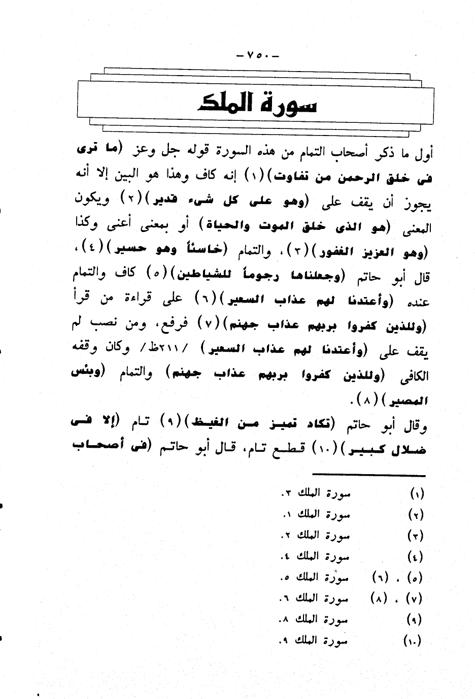 أول ما ذكر أصحاب التمام من هذه السورة قوله جل وعز {ما ترى في خلق الرحمن من تفاوت} إنه كاف وهذا هو البين إلا أنه يجوز أن يقف على {وهو على كل شيء قدير} ويكون المعنى {هو الذي خلق الموت والحياة} أو بمعنى أعني وكذا {وهو العزيز الغفور} والتمام {خاسئا وهو حسير} قال ابو حاتم {وجعلناها رجوما للشياطين} كاف والتمام عنده {وأعتدنا لهم عذاب السعير} على قراءة من قرأ {وللذين كفروا بربهم عذاب جهنم} فرفع، ومن نصب لم يقف على {وأعتدنا لهم عذاب السعير} وكان وقفه الكافي {وللذين كفروا بربهم عذاب جهنم} والتمام {وبئس المصير}.