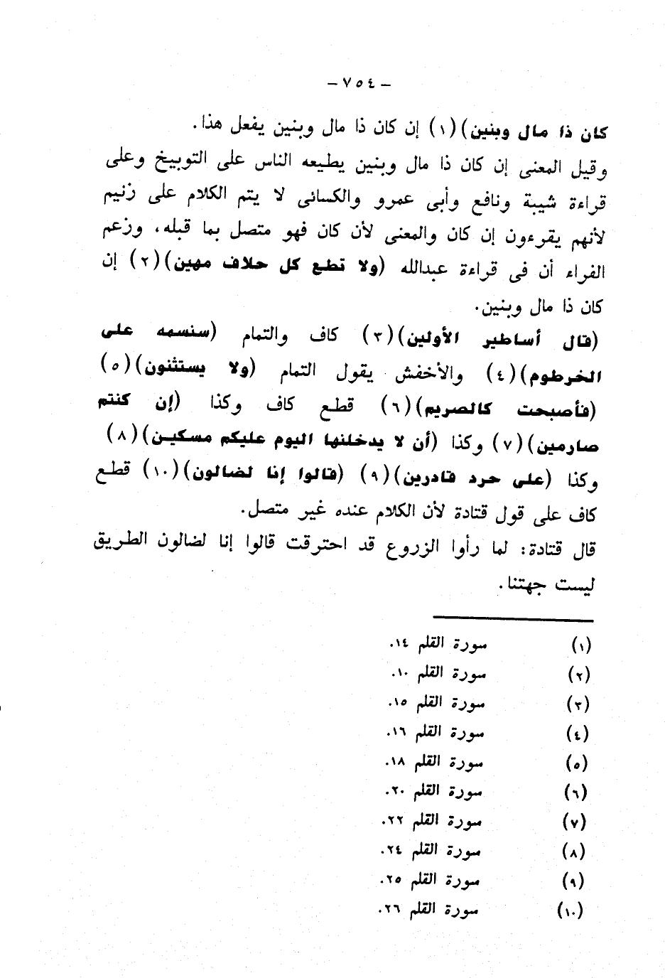 {قال أساطير الأولين} كاف والتمام {سنسمه على الخرطوم} والأخفش يقول التمام {ولا يستثنون} {فأصبحت كالصريم} قطع كاف وكذا {إن كنتم صارمين} وكذا {أن لا يدخلنها اليوم عليكم مسكين} وكذا {على حرد قادرين} {قالوا إنا لضالون} قطع كاف على قول قتادة لأن الكلام عنده غير متصل.