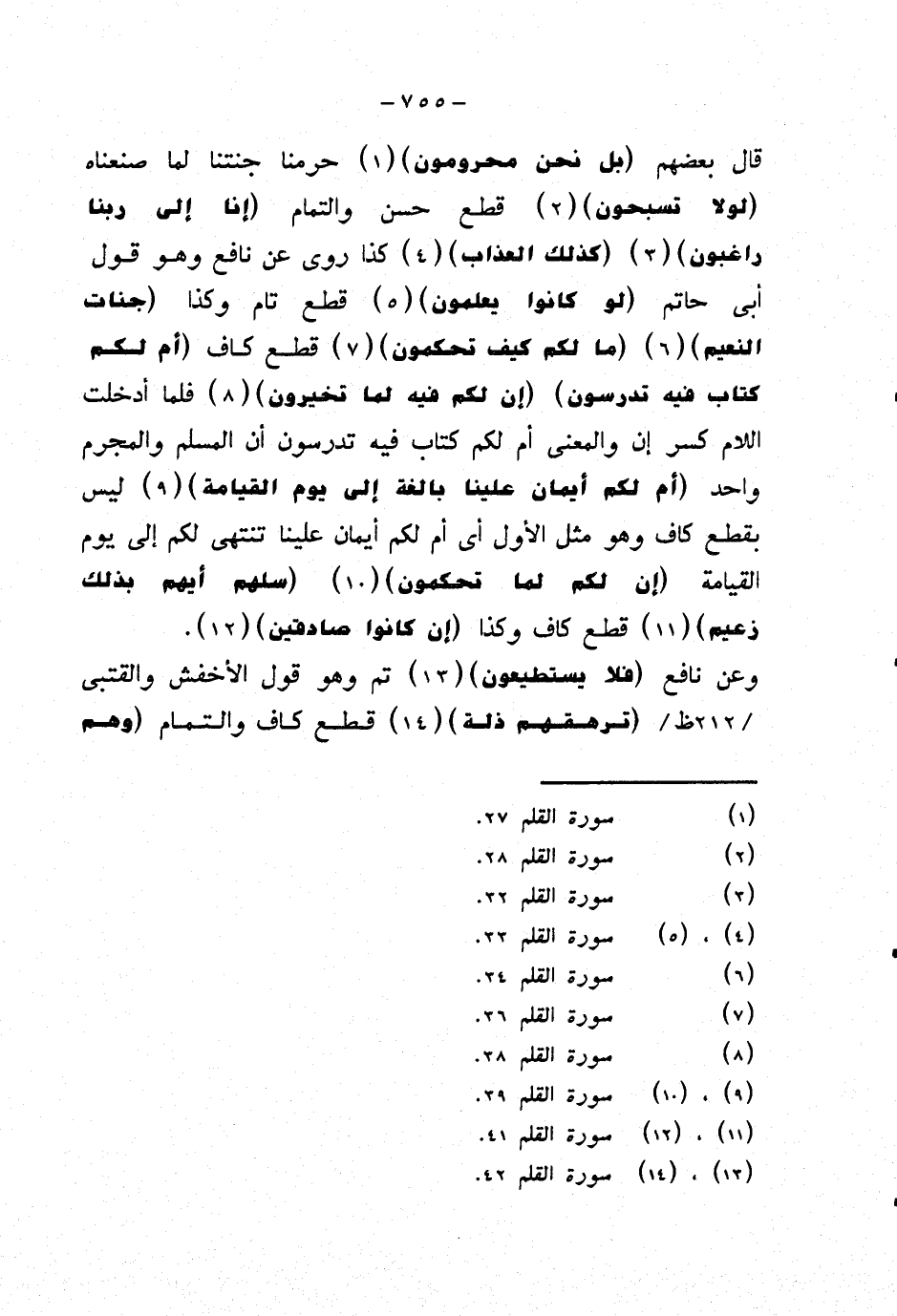 قال بعضهم {بل نحن محرومون} حرمنا جنتنا لما صنعناه {لولا تسبحون} قطع حسن والتمام {إنا إلى ربنا راغبون} {كذلك العذاب} كذا روى عن نافع وهو قول أبي حاتم {لو كانوا يعلمون} قطع تام وكذا {جنات النعيم} {ما لكم كيف تحكمون} قطع كاف {أم لكم كتاب فيه تدرسون} {إن لكم فيه لما تخيرون} فلما أدخلت اللام كسر إن والمعنى أم لكم كتاب فيه تدرسون أن المسلم والمجرم واحد {أم لكم أيمان علينا بالغة إلى يوم القيامة} ليس بقطع كاف وهو مثل الأول أي أم لكم أيمان علينا تنتهي لكم إلى يوم القيامة {إن لكم لما تحكمون} {سلهم أيهم بذلك زعيم} قطع كاف وكذا {إن كانوا صادقين}.