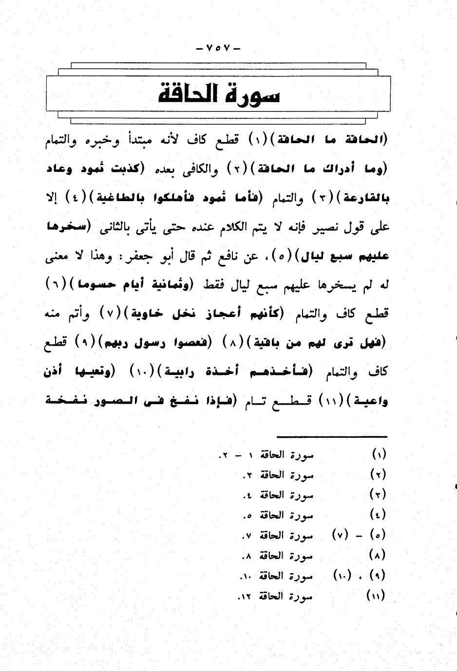 {الحاقة ما الحاقة} قطع كاف لأنه مبتدأ وخبره والتمام {وما أدراك ما الحاقة} والكافي بعده {كذبت ثمود وعاد بالقارعة} والتمام {فأما ثمود فأهلكوا بالطاغية} إلا على قول نصير فإنه لا يتم الكلام عنده حتى يأتي بالثاني {سخرها عليهم سبع ليال}، عن نافع ثم قال أبو جعفر: وهذا لا معنى له لم يسخرها عليهم سبع ليال فقط {وثمانية أيام حسوما} قطع كاف والتمام {كأنهم أعجاز نخل خاوية} وأتم منه {فهل ترى لهم من باقية} {فعصوا رسول ربهم} قطع كاف والتمام {فأخذهم أخذة رابية} {وتعيها أذن واعية} قطع تام {فإذا نفخ في الصور نفخة