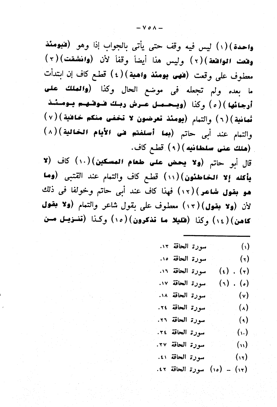 قال أبو حاتم {ولا يحض على طعام المسكين} كاف {لا يأكله إلا الخاطئون} قطع كاف والتمام عند القتبي {وما هو بقول شاعر} فهذا كاف عند أبي حاتم وخولفا في ذلك لأن {ولا بقول} معطوف على بقول شاعر والتمام {ولا بقول كاهن} وكذا {قليلا ما تذكرون} وكذا {تنزيل من