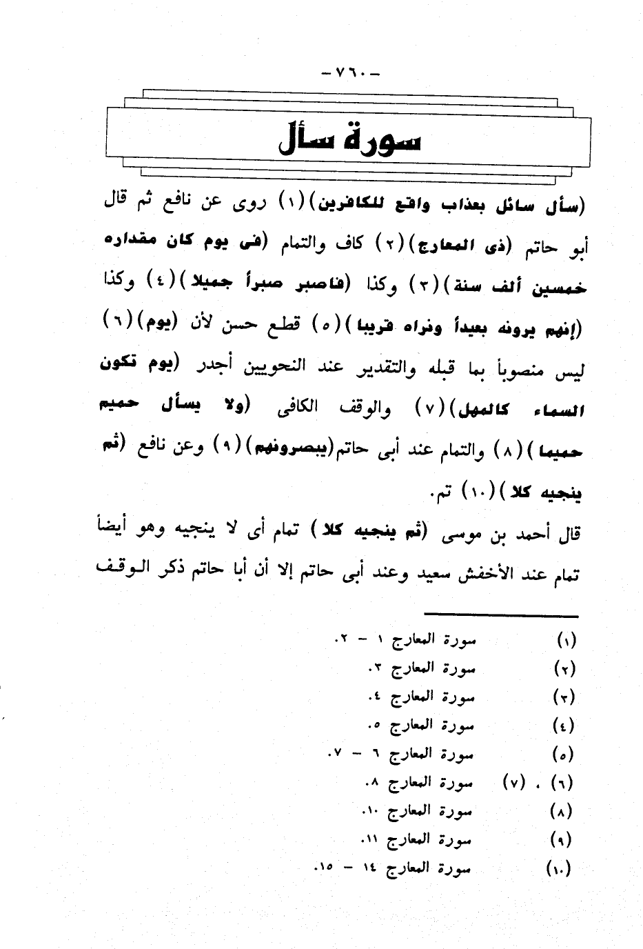{سأل سائل بعذاب واقع للكافرين} روى عن نافع ثم قال أبو حاتم {ذي المعارج} كاف والتمام {في يوم كان مقداره خمسين ألف سنة} وكذا {فاصبر صبرا جميلا} وكذا {إنهم يرونه بعيدا ونراه قريبا} قطع حسن لأن {يوم} ليس منصوبا بما قبله والتقدير عند النحويين أجدر {يوم تكون السماء كالمهل} والوقف الكافي {ولا يسأل حميم حميما} والتمام عند أبي حاتم {يبصرونهم} وعن نافع {ثم ينجيه كلا} تم.